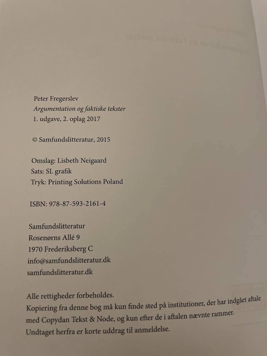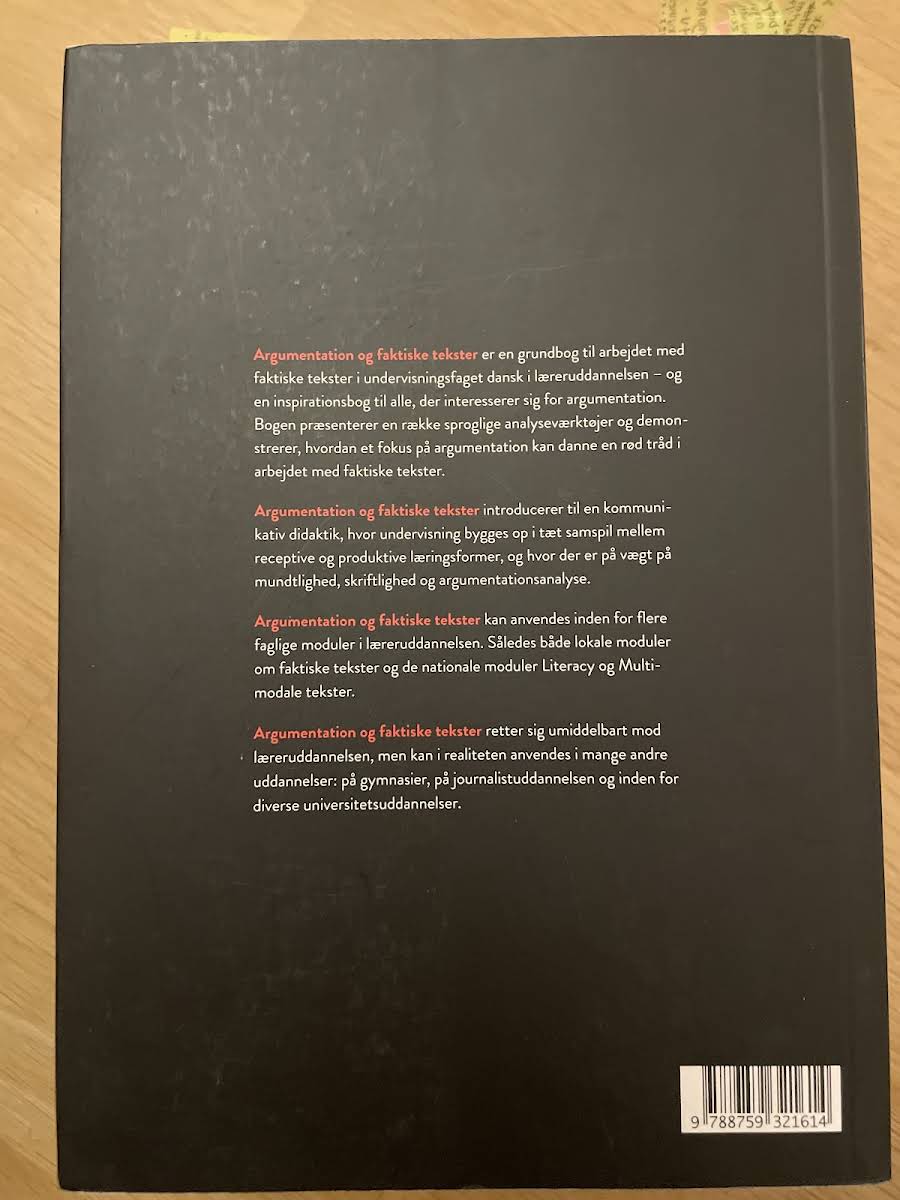 "Argumentation og faktiske tekster" er en grundbog, der udstyrer læsere med centrale sproglige analyseværktøjer og en dybdegående introduktion til argumentation som en rød tråd i arbejdet med faktiske tekster. Bogen fremmer en kommunikativ didaktik, hvor kombinationen af receptive og produktive læringsformer understøttes af særligt fokus på mundtlighed, skriftlighed og argumentationsanalyse. Med udgangspunkt i læreruddannelsens behov tilbyder denne bog en alsidig tilgang, der kan anvendes i lokale moduler om faktiske tekster samt i de nationale moduler for Literacy og Multimodale tekster. Selvom fokus primært er rettet mod læreruddannelsen, fungerer bogen også som en værdifuld ressource for undervisere på gymnasier, på journalistuddannelser og inden for diverse universitetsprogrammer.