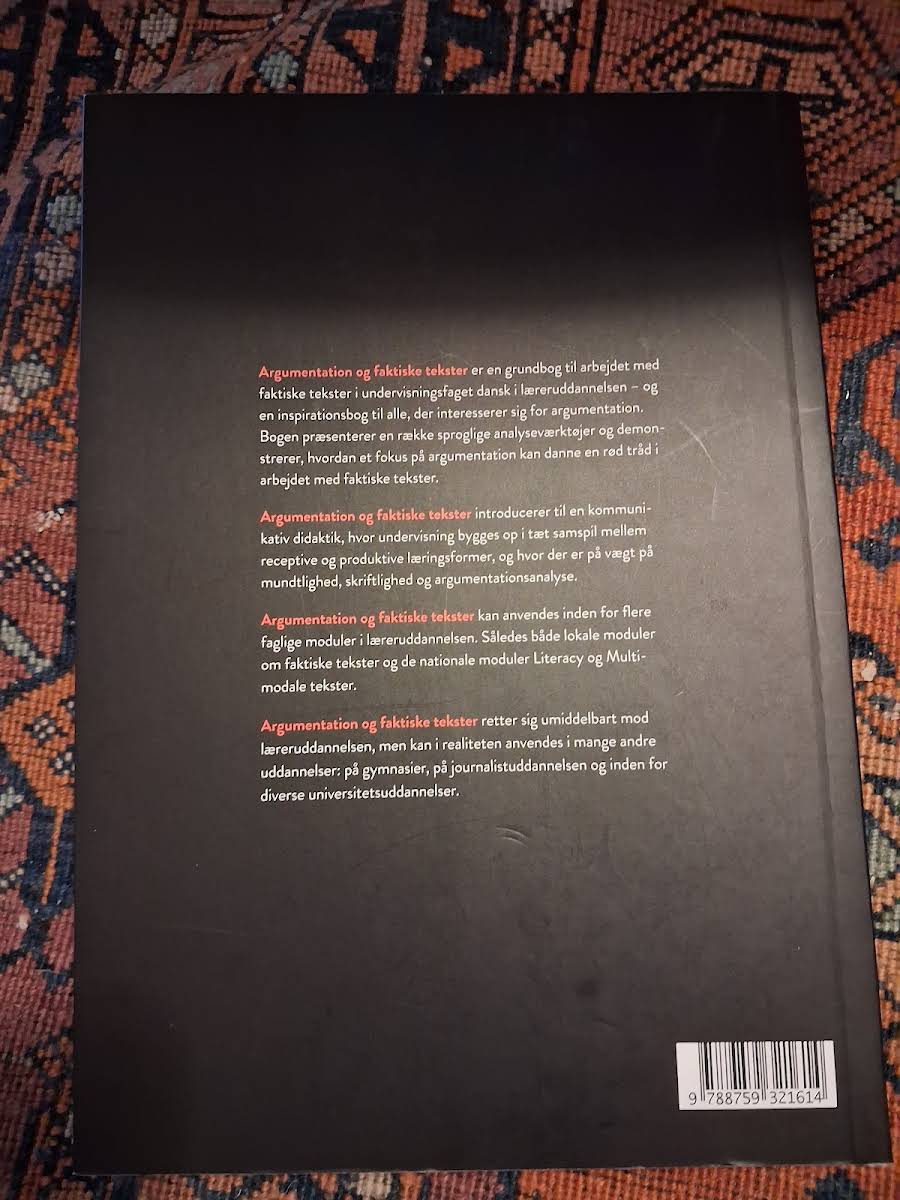"Argumentation og faktiske tekster" er en grundbog, der udstyrer læsere med centrale sproglige analyseværktøjer og en dybdegående introduktion til argumentation som en rød tråd i arbejdet med faktiske tekster. Bogen fremmer en kommunikativ didaktik, hvor kombinationen af receptive og produktive læringsformer understøttes af særligt fokus på mundtlighed, skriftlighed og argumentationsanalyse. Med udgangspunkt i læreruddannelsens behov tilbyder denne bog en alsidig tilgang, der kan anvendes i lokale moduler om faktiske tekster samt i de nationale moduler for Literacy og Multimodale tekster. Selvom fokus primært er rettet mod læreruddannelsen, fungerer bogen også som en værdifuld ressource for undervisere på gymnasier, på journalistuddannelser og inden for diverse universitetsprogrammer.