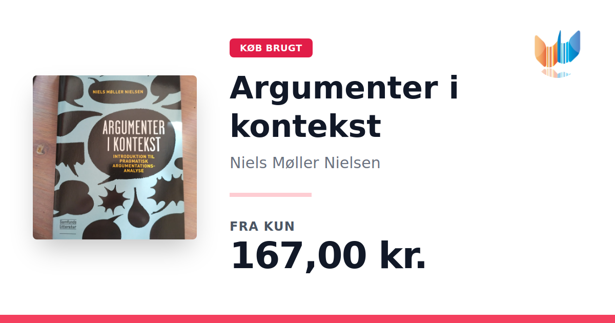 Lige nu kan du købe "Argumenter i kontekst" af Niels Møller Nielsen til kun 167,00 kr. Bogen du ser her er brugt, og i perfekt stand. Vi har i øjeblikket 2 eksemplarer til salg af "Argumenter i kontekst", så husk at se de forskellige udgaver.