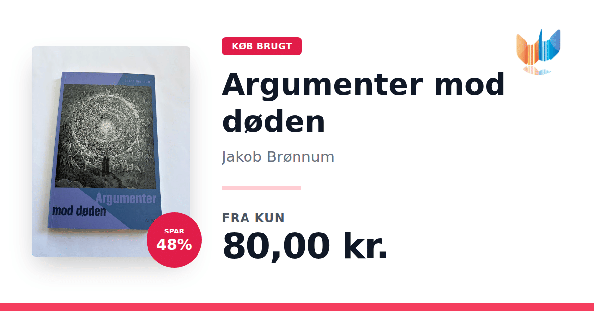 Lige nu kan du købe "Argumenter mod døden" af Jakob Brønnum til kun 80,00 kr. Du sparer hele 48% af nyprisen! Bogen du ser her er brugt, og i perfekt stand. Vi har i øjeblikket kun et enkelt eksemplar til salg af "Argumenter mod døden", så slå til mens du kan!
