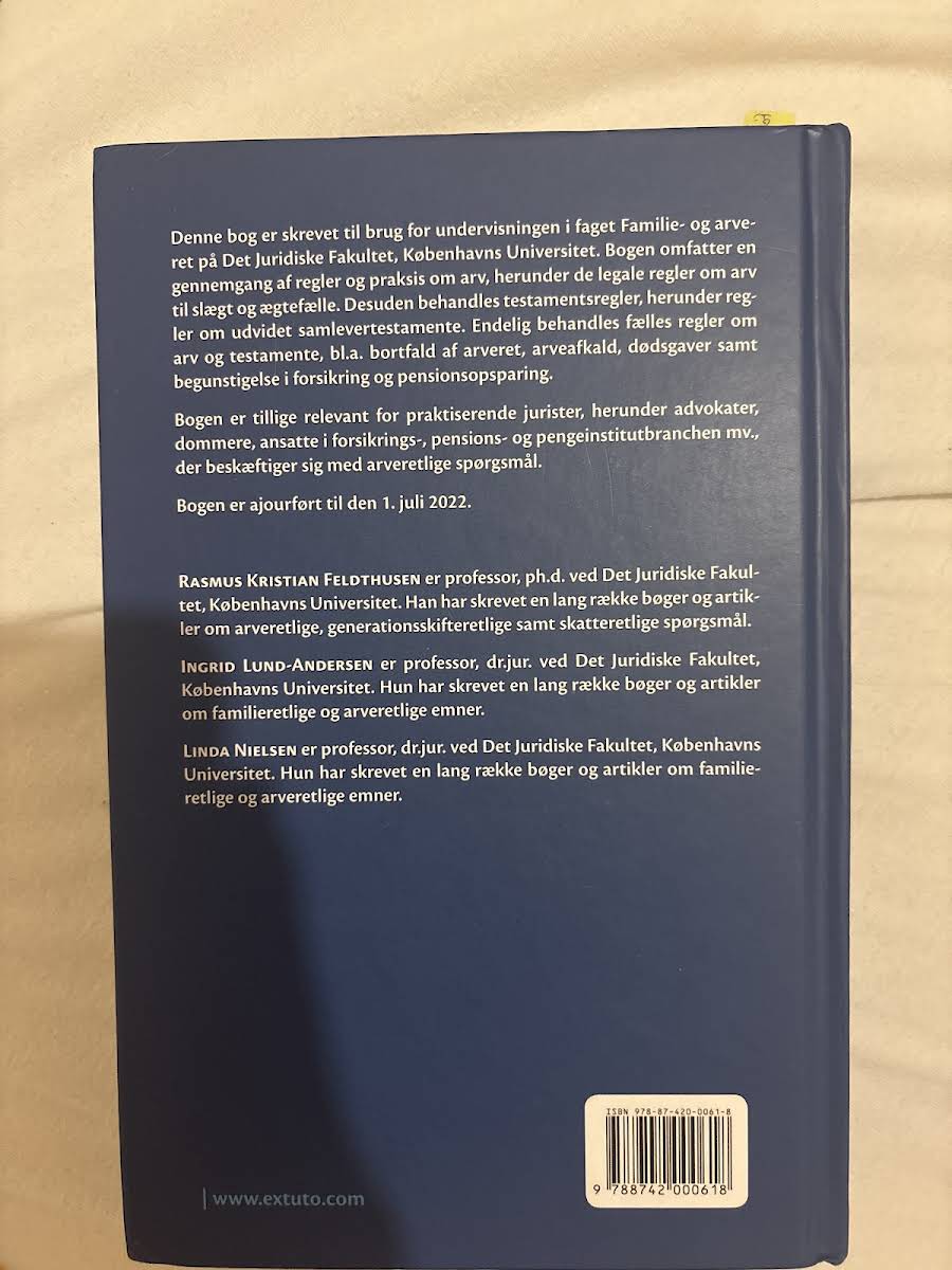 Arveretten, 7. udgave er skrevet til brug i undervisningen på Det Juridiske Fakultet, Københavns Universitet, i faget Familie- og arveret. Bogen giver en systematisk og lettilgængelig gennemgang af både de grundlæggende regler og den praksis, der gælder for arveretlige spørgsmål. Du får en detaljeret behandling af de legale regler om arv til slægt og ægtefælle samt de centrale testamentsregler - herunder de særlige bestemmelser om udvidet samlevertestamente. Desuden gennemgås de fælles regler på arve- og testamentsområdet med emner som bortfald af arveret, arveafkald, dødsgaver og begunstigelse i forsikring og pensionsopsparing. Bogen er ajourført til 1. juli 2022 og henvender sig ikke kun til studerende, men også til praktiserende jurister, advokater, dommere samt medarbejdere i forsikrings-, pensions- og pengeinstitutbranchen. 7. udgave, 308 sider, hardcover. Forfattere: Rasmus Kristian Feldthusen, Linda Nielsen og Ingrid Lund Andersen. Ex Tuto Publishing, 2022.