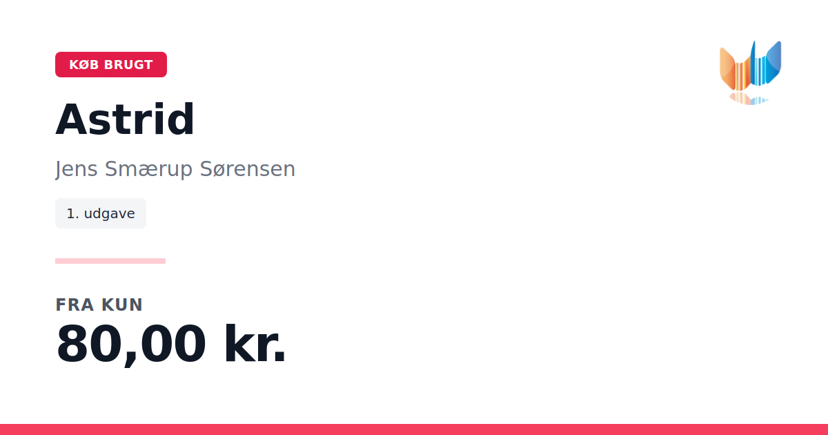 Lige nu kan du købe "Astrid" af Jens Smærup Sørensen til kun 80,00 kr. Du sparer hele 50% af nyprisen! Bogen du ser her er brugt, og i perfekt stand. Vi har i øjeblikket kun et enkelt eksemplar til salg af "Astrid", så slå til mens du kan!
