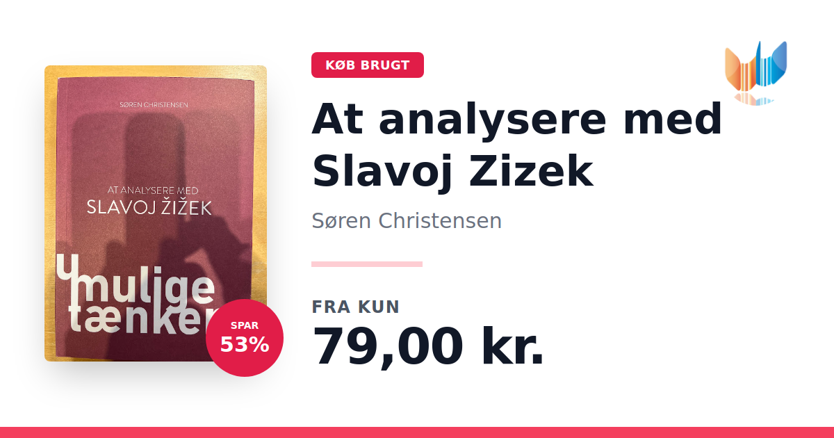 Lige nu kan du købe "At analysere med Slavoj Zizek" af Søren Christensen til kun 79,00 kr. Du sparer hele 53% af nyprisen! Bogen du ser her er brugt, og i perfekt stand. Vi har i øjeblikket kun et enkelt eksemplar til salg af "At analysere med Slavoj Zizek", så slå til mens du kan!