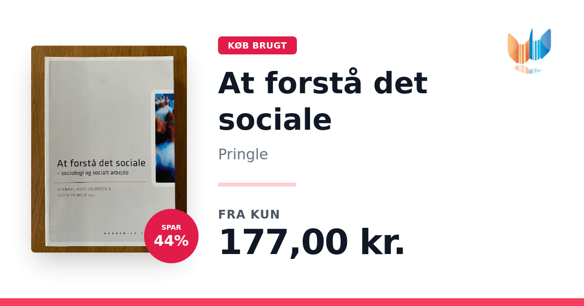 Lige nu kan du købe "At forstå det sociale" af Pringle til kun 177,00 kr. Du sparer hele 44% af nyprisen! Bogen du ser her er brugt, og i perfekt stand. Vi har i øjeblikket kun et enkelt eksemplar til salg af "At forstå det sociale", så slå til mens du kan!