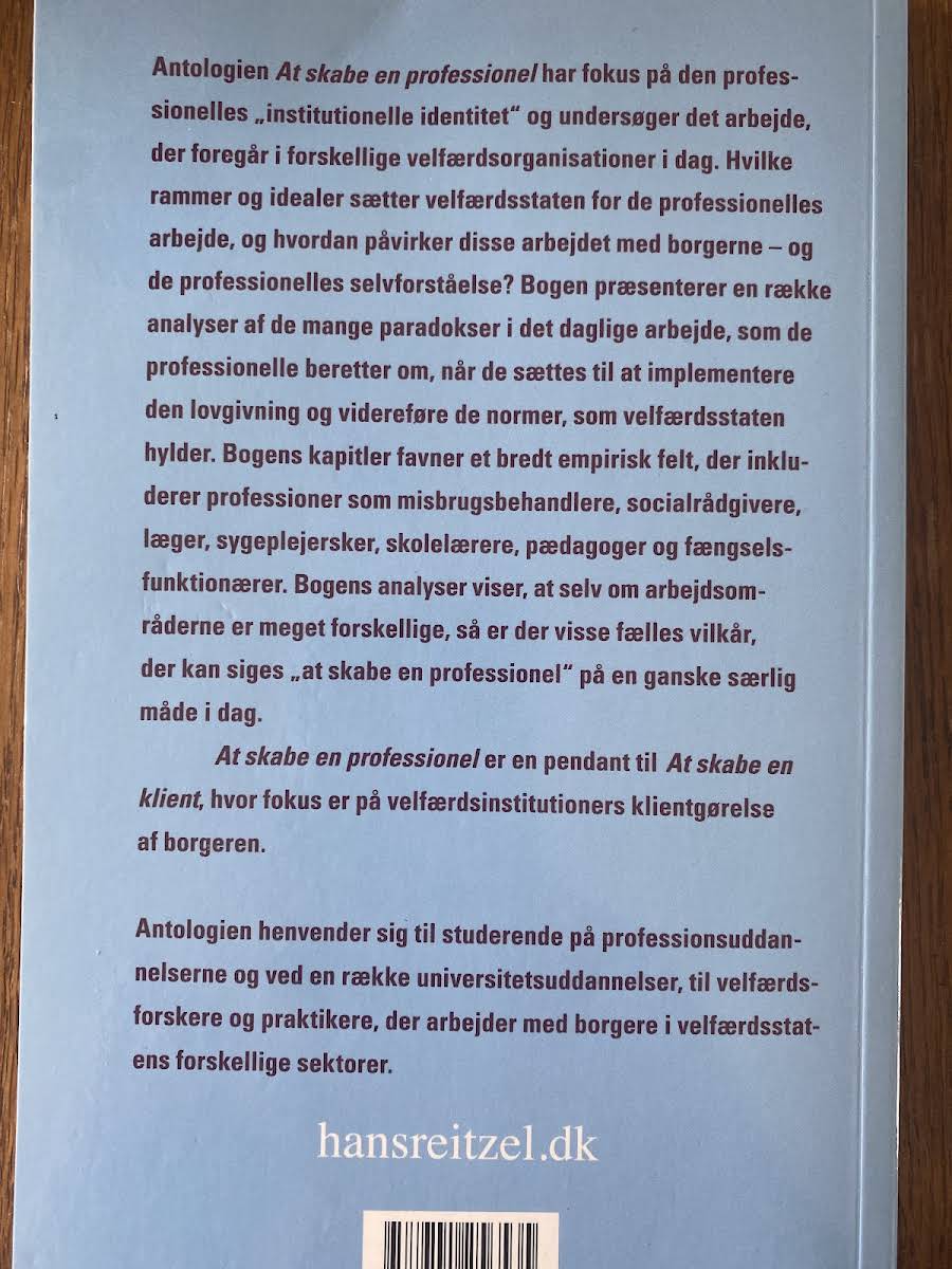 "At skabe en professionel" er en antologi, der dykker ned i den institutionelle identitet og de særlige rammer, som velfærdsstaten sætter for de professionelle. Gennem bidrag fra bl.a. Margaretha Järvinen, Nanna Mik-meyer, Anne Roelsgaard Obling, Helle Bjerg, Hanne Knudsen, Malene Molding Nielsen, Kathrine Vitus, Marie Østergaard Møller, Jens Kofod og Kathrine Hoffmann Pii udfolder bogen, hvordan disse rammer påvirker både arbejdet i velfærdsorganisationer og de professionelle aktørers selvopfattelse. Med et bredt empirisk udsnit, der spænder over områder som socialt arbejde, sundhed, pædagogik og fængselssektoren, giver bogen indblik i de paradokser og dilemmaer, som de professionelle møder i deres daglige praksis. Bogen henvender sig til studerende på professionsuddannelser og universiteter, der beskæftiger sig med forskning i velfærdsinstitutioner, samt til praktikere, der ønsker en dybere forståelse af, hvad der skal til for at forme en professionel i dagens komplekse arbejdsmiljø.