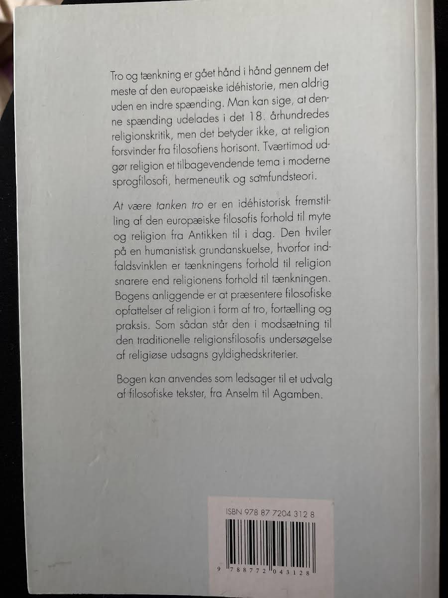 Religion og tænkning har fulgtes ad gennem europæisk idéhistorie, men altid i en spænding mellem tro og fornuft. Selvom 1700-talets religionskritik tilsyneladende udelukker denne spænding, forsvinder religion aldrig helt fra filosofiens horisont. Tværtimod træder den frem igen og igen i moderne sprogfilosofi, hermeneutik og samfundsteori. I At være tanken tro - Religion i filosofihistorisk kontekst præsenterer Lars Albinus en idéhistorisk gennemgang af religiøse forestillinger og myter fra antikken til i dag. Bogen bygger på en humanistisk grundanskuelse, hvor fokus ligger på tænkningens forhold til religion frem for omvendt. Albinus udfolder filosofiske tilgange til religion som tro, fortælling og praksis og sætter dem over for den klassiske religionsfilosofis optik, der primært undersøger religiøse udsagns gyldighedskriterier. Med sit overskuelige overblik kan værket indgå som supplement til en række filosofiske tekster, fra Anselm til Agamben.