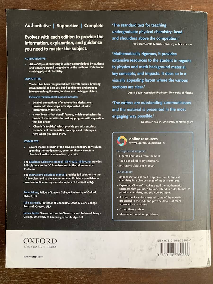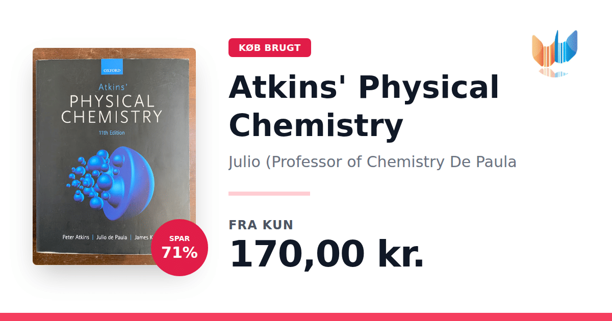 Atkins’ Physical Chemistry, 11. udgave, er forfattet af Peter Atkins, Julio de Paula og James Keeler og udgivet af Oxford University Press i 2022. Med sine 960 sider er den stadig det foretrukne værk for studerende og undervisere, der ønsker et dybdegående og samtidig overskueligt indblik i fysisk kemi. Teksten er omstruktureret i selvstændige Topics, hvilket giver undervisere fleksibilitet til at sammensætte forløb og studerende et mere læsevenligt format. Hvert Topic indleder med centrale spørgsmål, som besvares gennem trinvis matematisk analyse og illustrative eksempler. Den nyeste udgave er udvidet med ekstra matematikstøtte og ’Chemist’s Toolkits’ - kompakte oversigter over de vigtigste formler og teknikker placeret, præcis hvor de behøves. Dermed bliver komplekse beregninger mere tilgængelige, uden at sammenhængen til kemien går tabt. Afslutningsvis præsenterer tjeklister i hver Topic de væsentligste begreber og gennemgangspunkter. Den kombinerede dækning af teori, pædagogisk struktur og stærk matematikprofil gør Atkins’ Physical Chemistry til den uundværlige lærebog inden for fysisk kemi.