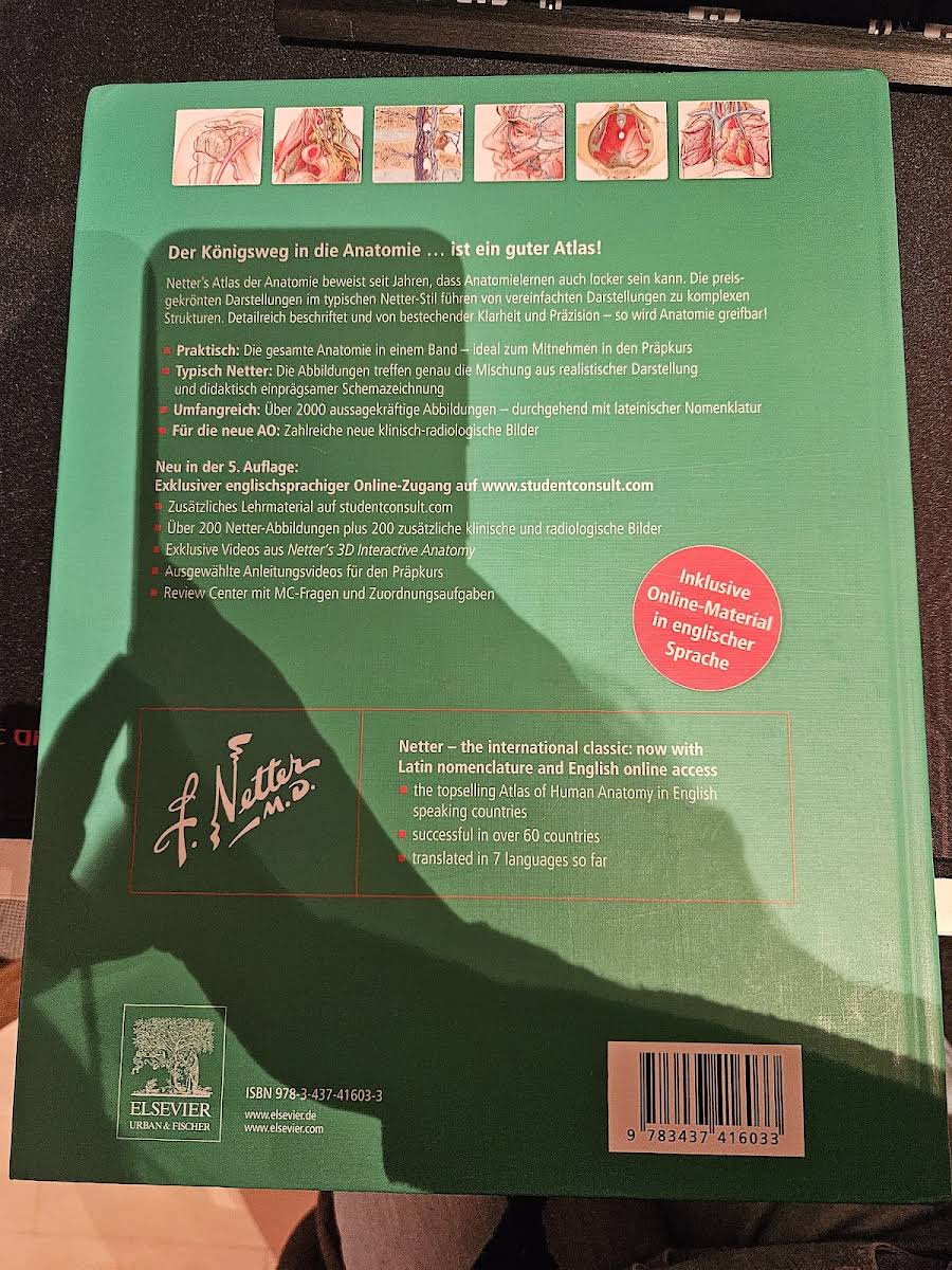 Atlas der Anatomie, af den anerkendte anatomiske illustrator Frank Netter, er et førende referenceværk inden for anatomi med latinsk nomenklatur. Denne 5. udgave fra 2011 indeholder 616 sider fyldt med detaljerede og illustrative gengivelser af menneskets anatomi. Det tysksprogede atlas suppleres med et engelsk indeks, hvilket gør det tilgængeligt for et internationalt publikum. Ud over de etablerede illustrationer omfatter denne udgave også online materiale, som giver brugeren adgang til videomateriale på Netter's 3D Interactive Anatomy. Desuden medfølger et multiple-choice test-center, der understøtter både studerende og fagfolk i en grundig forståelse af anatomien. Atlas der Anatomie er et uundværligt redskab for alle, der arbejder med og studerer anatomi.