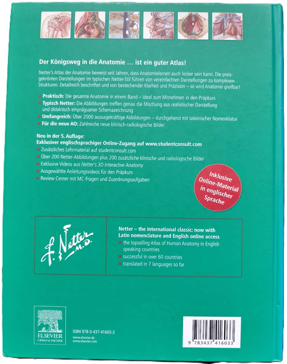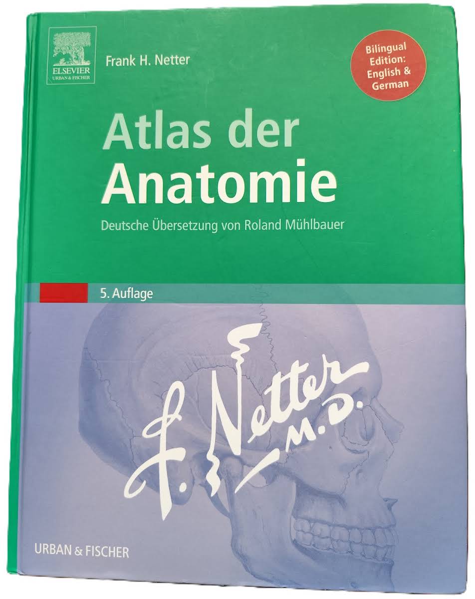Atlas der Anatomie, af den anerkendte anatomiske illustrator Frank Netter, er et førende referenceværk inden for anatomi med latinsk nomenklatur. Denne 5. udgave fra 2011 indeholder 616 sider fyldt med detaljerede og illustrative gengivelser af menneskets anatomi. Det tysksprogede atlas suppleres med et engelsk indeks, hvilket gør det tilgængeligt for et internationalt publikum. Ud over de etablerede illustrationer omfatter denne udgave også online materiale, som giver brugeren adgang til videomateriale på Netter's 3D Interactive Anatomy. Desuden medfølger et multiple-choice test-center, der understøtter både studerende og fagfolk i en grundig forståelse af anatomien. Atlas der Anatomie er et uundværligt redskab for alle, der arbejder med og studerer anatomi.