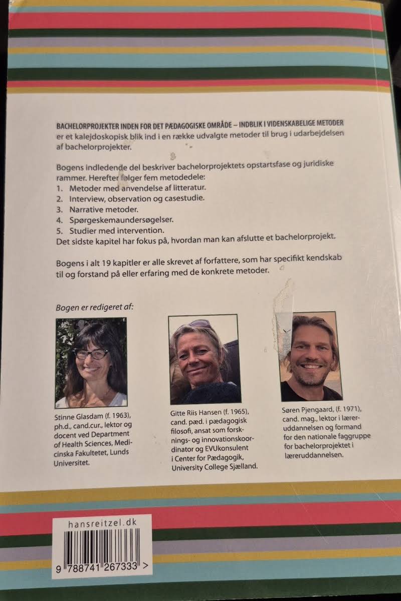 Bachelorprojekter inden for det pædagogiske område byder på et alsidigt indblik i udvalgte metoder, der kan anvendes ved udarbejdelsen af bachelorprojekter på det pædagogiske felt. Bogen præsenterer en struktureret tilgang med en indledende og afsluttende del samt fem centrale metodedele, der hver især fokuserer på praktisk anvendelse af litteraturarbejde, interviews, observationer og casestudier, narrative metoder, spørgeskemaundersøgelser samt studier med intervention. Med bidrag fra forfattere med solid erfaring og indgående kendskab til de konkrete metoder, appellerer denne bog primært til studerende og undervisere inden for professionsbacheloruddannelser på det pædagogiske område. Bogen, udgivet af Hans Reitzels Forlag i 2017, giver et velpræciseret og anvendeligt redskab til at navigere i bachelorprojektets mange metodiske udfordringer.