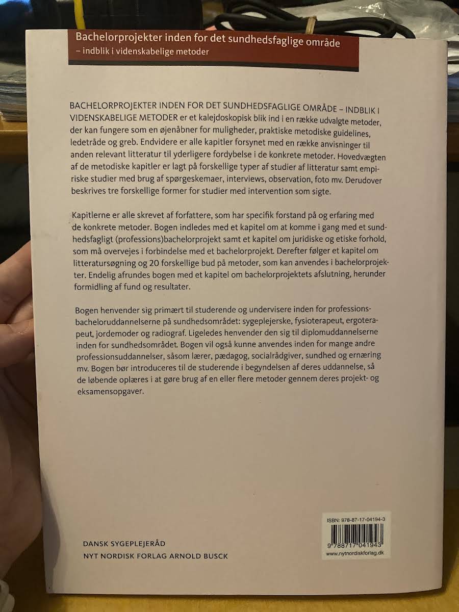 Bachelorprojekter inden for det sundhedsfaglige område byder på en nuanceret introduktion til en række videnskabelige metoder, der er uundværlige i udarbejdelsen af et sundhedsfagligt bachelorprojekt. Bogen giver læseren et indblik i både teoretiske og praktiske tilgange til projektarbejdet – fra den første idé til formidlingen af fund og resultater. Med fokus på studier af litteratur og empiriske undersøgelser via spørgeskemaer, interviews, observation, foto mv. præsenteres der desuden metoder, der omfatter interventioner i de sundhedsfaglige projekter. Hvert kapitel er udarbejdet af eksperter med særlig indsigt i de konkrete metoder og efterfølges af anbefalinger til yderligere fordybelse. Bogen er særligt rettet mod studerende og undervisere inden for professionsbacheloruddannelserne på sundhedsområdet, herunder sygeplejersker, fysioterapeuter, ergoterapeuter, jordemødre og radiografer, men den kan også anvendes inden for beslægtede fagområder. Den giver en grundig introduktion til både de juridiske og etiske forhold, som spiller en væsentlig rolle i udarbejdelsen af et bachelorprojekt. Med udgangspunkt i en struktureret og anvendelsesorienteret tilgang, er denne bog et essentielt redskab for dem, der ønsker at forstå og mestre metoderne bag et vellykket sundhedsfagligt bachelorprojekt.