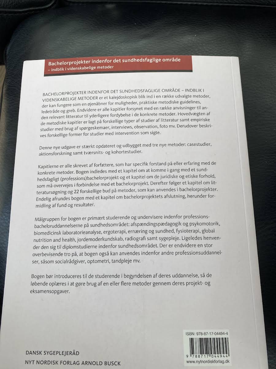 Når bachelorprojektet begynder at fylde hverdagen, byder denne håndbog på en grundig og praktisk indføring i de videnskabelige metoder, der er centrale for et succesfuldt projekt indenfor det sundhedsfaglige område. Bogen giver både et teoretisk og praktisk overblik over projektarbejdets forskellige faser, fra opstart og litteratursøgning til de empiriske studier og formidlingen af resultater. Med kapitler skrevet af erfarne forfattere og fagfolk indenfor feltet præsenteres en række metoder – herunder studier baseret på interviews, observationer, spørgeskemaundersøgelser og interventionsbaserede tilgange. Læseren introduceres til solide metodiske retningslinjer og får gode råd til yderligere fordybelse gennem udvalgt supplerende litteratur. Bogen er et værdifuldt redskab for studerende og undervisere på professionsbacheloruddannelser inden for sundhedsområdet. Den understøtter den metodiske opbygning af bachelorprojekterne og sikrer, at man med et solidt fundament kan gribe projektudfordringerne an – fra de første trin til det endelige formidlingsstadie.