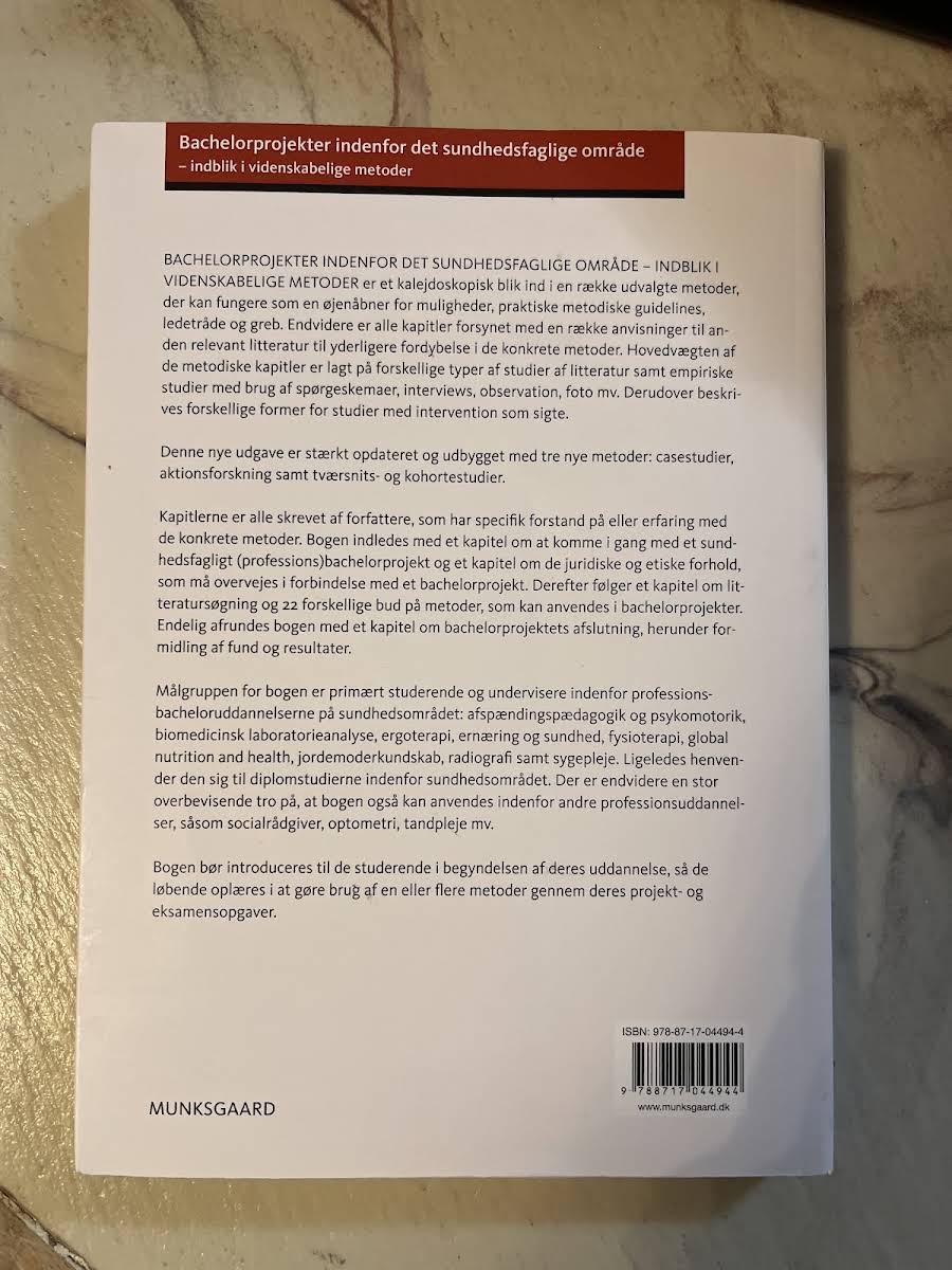 Når bachelorprojektet begynder at fylde hverdagen, byder denne håndbog på en grundig og praktisk indføring i de videnskabelige metoder, der er centrale for et succesfuldt projekt indenfor det sundhedsfaglige område. Bogen giver både et teoretisk og praktisk overblik over projektarbejdets forskellige faser, fra opstart og litteratursøgning til de empiriske studier og formidlingen af resultater. Med kapitler skrevet af erfarne forfattere og fagfolk indenfor feltet præsenteres en række metoder – herunder studier baseret på interviews, observationer, spørgeskemaundersøgelser og interventionsbaserede tilgange. Læseren introduceres til solide metodiske retningslinjer og får gode råd til yderligere fordybelse gennem udvalgt supplerende litteratur. Bogen er et værdifuldt redskab for studerende og undervisere på professionsbacheloruddannelser inden for sundhedsområdet. Den understøtter den metodiske opbygning af bachelorprojekterne og sikrer, at man med et solidt fundament kan gribe projektudfordringerne an – fra de første trin til det endelige formidlingsstadie.