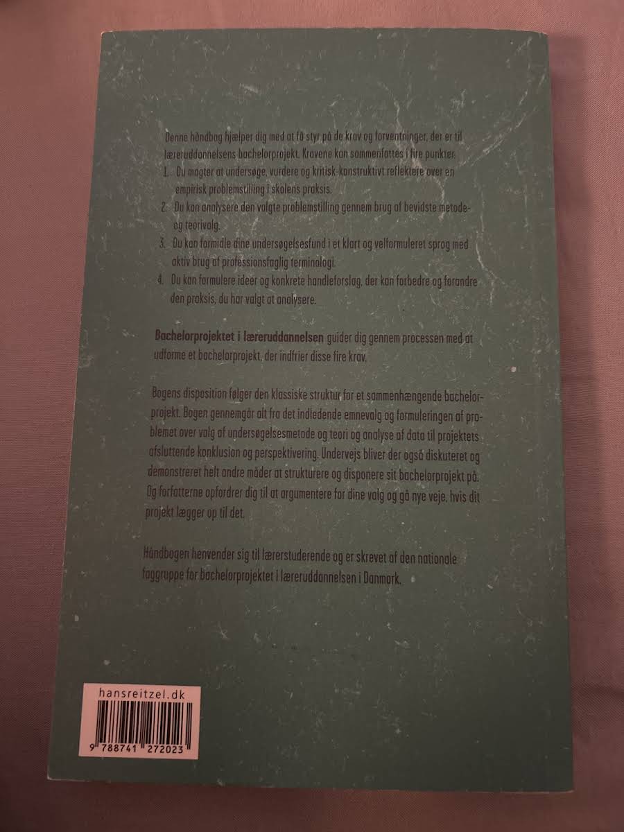 Bachelorprojektet i læreruddannelsen er en praktisk vejledning, der støtter lærerstuderende i udarbejdelsen af et solidt og reflekteret bachelorprojekt. Bogen introducerer fire centrale krav – evnen til at undersøge og vurdere empiriske problemstillinger, at vælge egnede metoder og teorier, at formidle resultaterne klart og præcist samt at formulere konkrete forslag til forbedringer i praksis. Gennem bogens klassiske struktur guides du fra det indledende emnevalg og formuleringen af problemet, via teori og dataanalyser, til den afsluttende konklusion og perspektivering. Forfatterne opfordrer til kritisk refleksion og faglig argumentation, så du kan bane nye veje og tage velbegrundede valg i dit projekt. Med sine 208 sider udgivet af Hans Reitzels Forlag i 2019 er denne håndbog et uundværligt redskab for den studerende på læreruddannelsen.