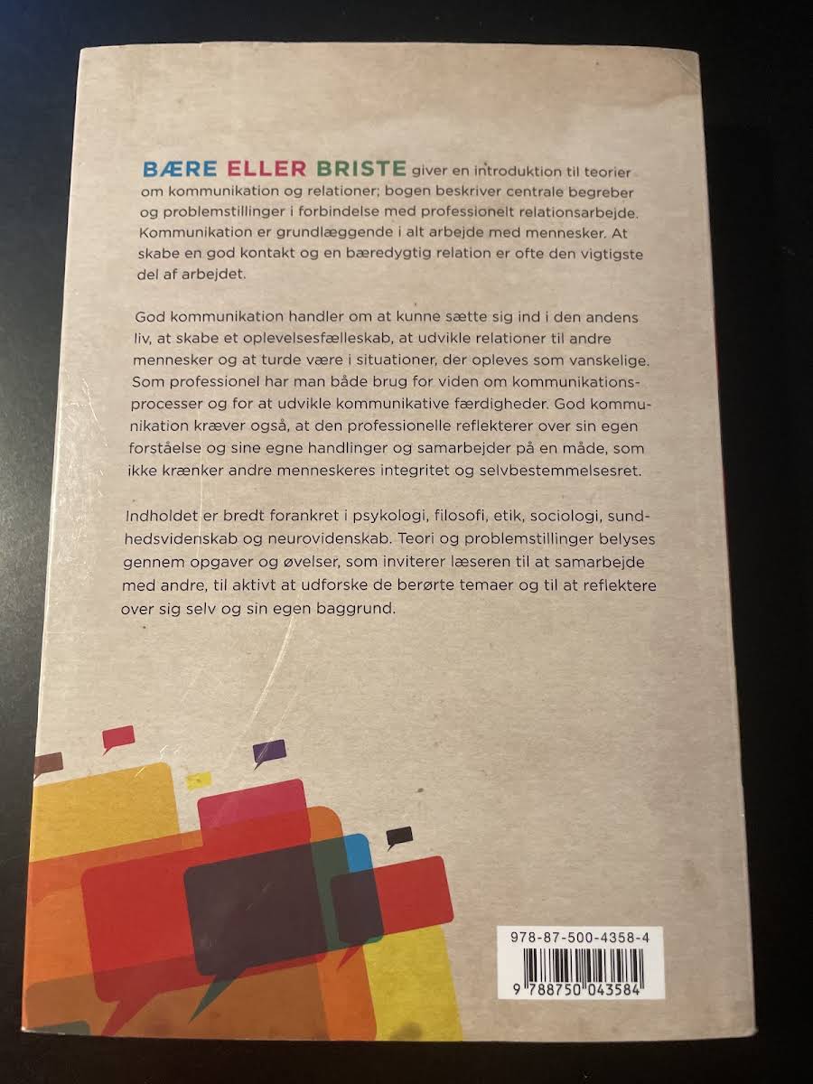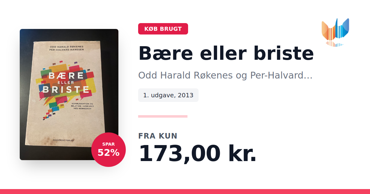 I "Bære eller briste" dykker Odd Harald Røkenes og Per-Halvard Hanssen ned i kommunikation og relation, som er hjørnestenene i ethvert arbejde med mennesker. Bogen belyser, hvordan god kommunikation går ud over blot at gøre sig forstået – den handler om at udvikle en dyb personlig professionalitet, forstå andres perspektiver og skabe meningsfulde forbindelser. Med teoretiske indsigter, der trækker på psykologi, filosofi, etik, sociologi, sundhedsvidenskab og neurovidenskab, præsenterer forfatterne centrale begreber og problemstillinger på en nuanceret og indsigtsfuld måde. "Bære eller briste" henvender sig til alle, der arbejder med mennesker – fra studerende til erfarne fagpersoner. Bogen indeholder en række opgaver og øvelser, som konkretiserer teorien og hjælper læseren med at omsætte indsigt til praksis. Med sit pædagogiske udgangspunkt er bogen et værdifuldt redskab for alle, der ønsker at styrke deres kommunikations- og relationskompetencer i det daglige arbejde.