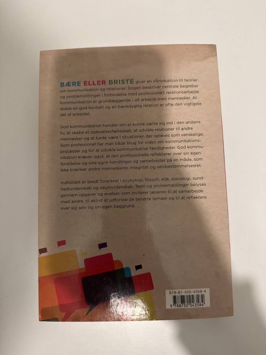 I "Bære eller briste" dykker Odd Harald Røkenes og Per-Halvard Hanssen ned i kommunikation og relation, som er hjørnestenene i ethvert arbejde med mennesker. Bogen belyser, hvordan god kommunikation går ud over blot at gøre sig forstået – den handler om at udvikle en dyb personlig professionalitet, forstå andres perspektiver og skabe meningsfulde forbindelser. Med teoretiske indsigter, der trækker på psykologi, filosofi, etik, sociologi, sundhedsvidenskab og neurovidenskab, præsenterer forfatterne centrale begreber og problemstillinger på en nuanceret og indsigtsfuld måde. "Bære eller briste" henvender sig til alle, der arbejder med mennesker – fra studerende til erfarne fagpersoner. Bogen indeholder en række opgaver og øvelser, som konkretiserer teorien og hjælper læseren med at omsætte indsigt til praksis. Med sit pædagogiske udgangspunkt er bogen et værdifuldt redskab for alle, der ønsker at styrke deres kommunikations- og relationskompetencer i det daglige arbejde.