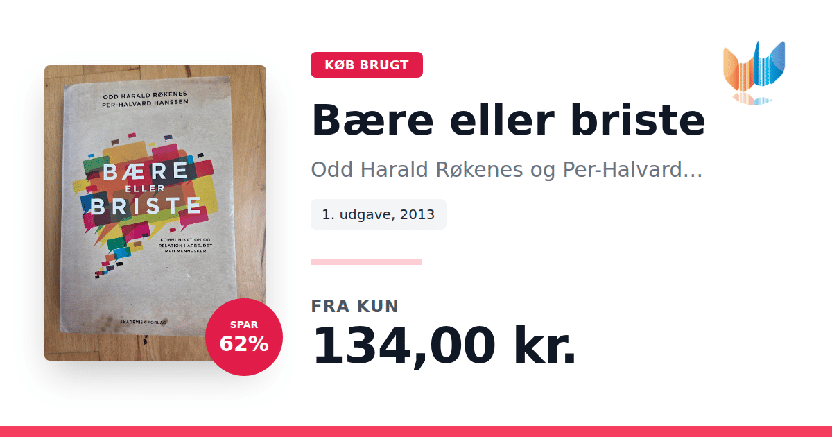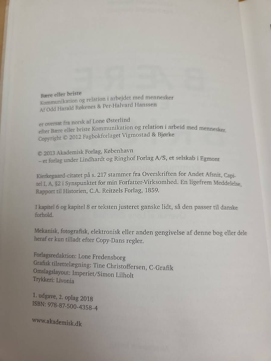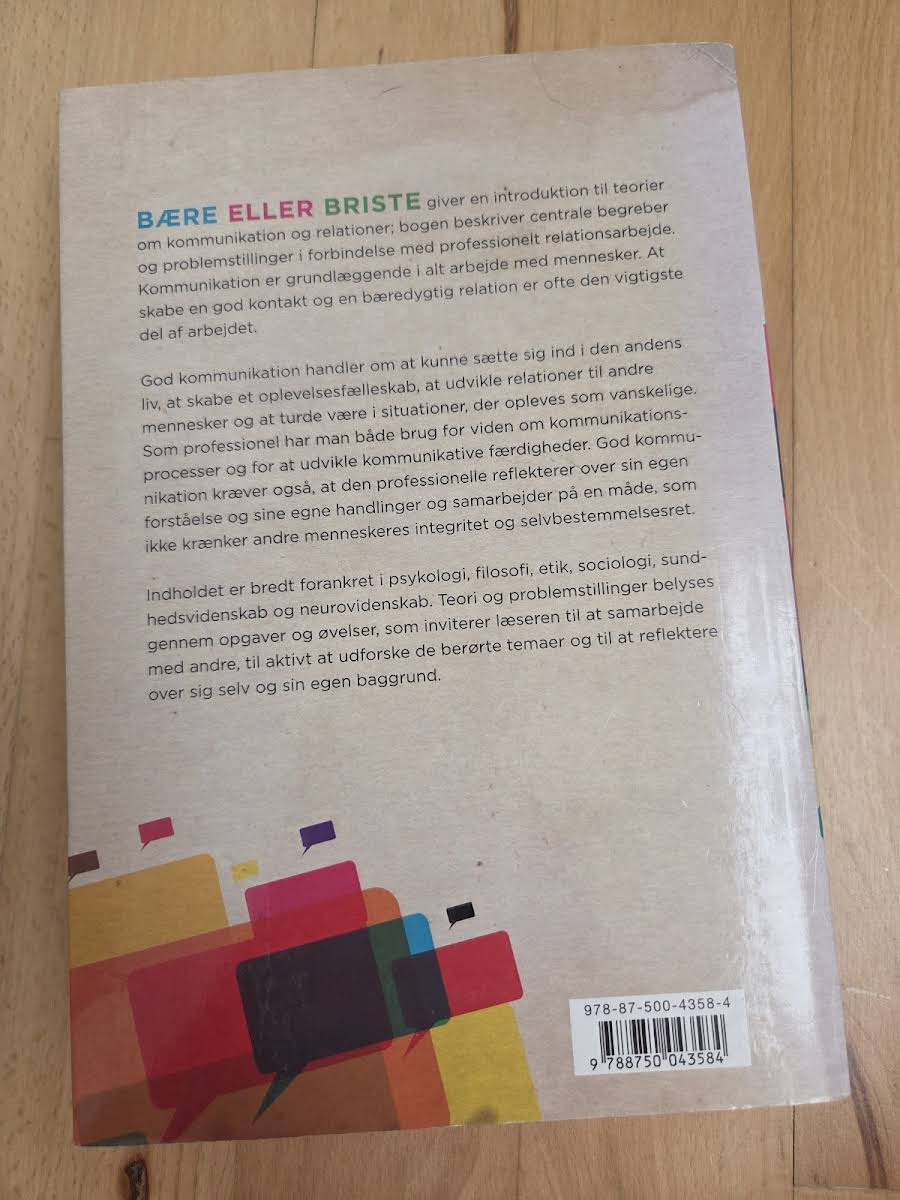 I "Bære eller briste" dykker Odd Harald Røkenes og Per-Halvard Hanssen ned i kommunikation og relation, som er hjørnestenene i ethvert arbejde med mennesker. Bogen belyser, hvordan god kommunikation går ud over blot at gøre sig forstået – den handler om at udvikle en dyb personlig professionalitet, forstå andres perspektiver og skabe meningsfulde forbindelser. Med teoretiske indsigter, der trækker på psykologi, filosofi, etik, sociologi, sundhedsvidenskab og neurovidenskab, præsenterer forfatterne centrale begreber og problemstillinger på en nuanceret og indsigtsfuld måde. "Bære eller briste" henvender sig til alle, der arbejder med mennesker – fra studerende til erfarne fagpersoner. Bogen indeholder en række opgaver og øvelser, som konkretiserer teorien og hjælper læseren med at omsætte indsigt til praksis. Med sit pædagogiske udgangspunkt er bogen et værdifuldt redskab for alle, der ønsker at styrke deres kommunikations- og relationskompetencer i det daglige arbejde.