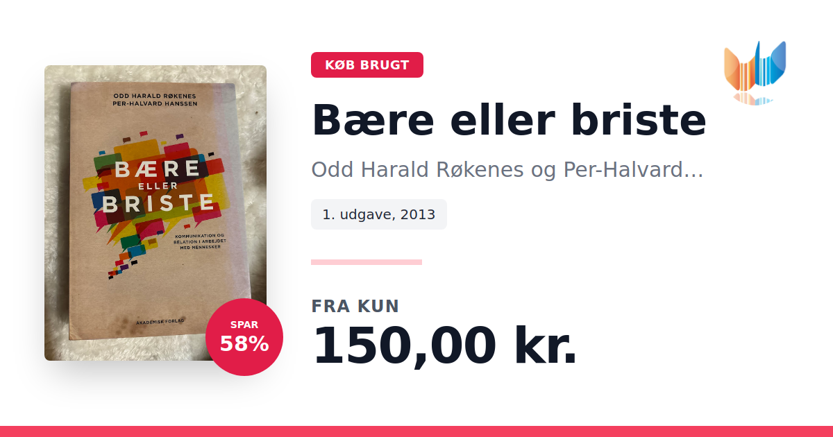 Lige nu kan du købe "Bære eller briste" af Odd Harald Røkenes og Per-Halvard Hanssen til kun 150,00 kr. Du sparer hele 58% af nyprisen! Bogen du ser her er brugt, og i god stand. Vi har i øjeblikket 3 eksemplarer til salg af "Bære eller briste", så husk at se de forskellige udgaver.