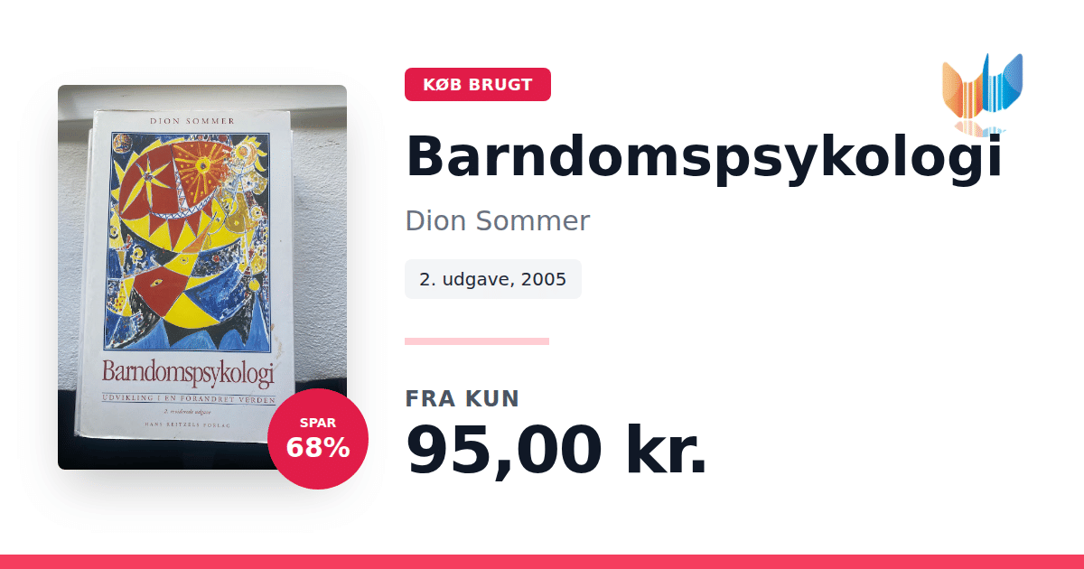 Lige nu kan du købe "Barndomspsykologi" af Dion Sommer til kun 95,00 kr. Du sparer hele 68% af nyprisen! Bogen du ser her er brugt, og i god stand. Vi har i øjeblikket 9 eksemplarer til salg af "Barndomspsykologi", så husk at se de forskellige udgaver.