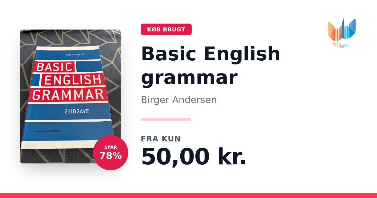 Lige nu kan du købe "Basic English grammar" af Birger Andersen til kun 50,00 kr. Du sparer hele 78% af nyprisen! Bogen du ser her er brugt, og i perfekt stand. Vi har i øjeblikket 2 eksemplarer til salg af "Basic English grammar", så husk at se de forskellige udgaver.