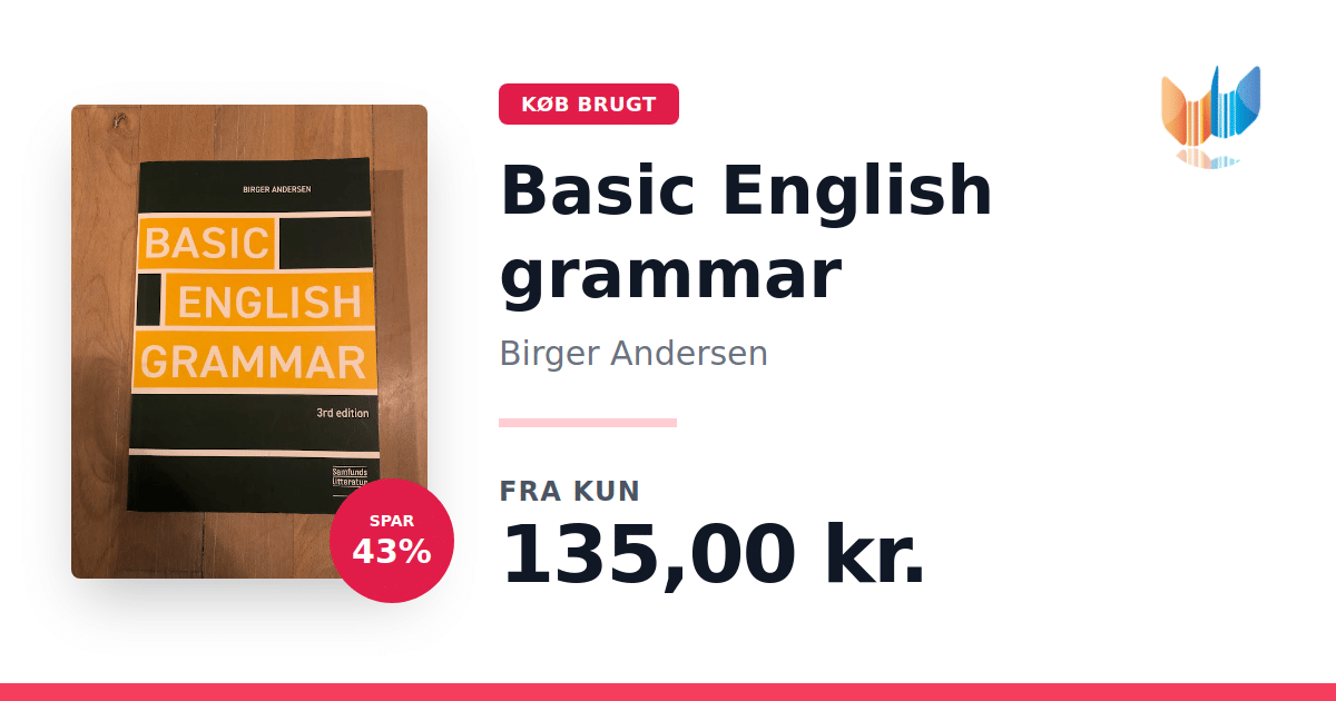 Lige nu kan du købe "Basic English grammar" af Birger Andersen til kun 135,00 kr. Du sparer hele 43% af nyprisen! Bogen du ser her er brugt, og i perfekt stand. Vi har i øjeblikket 2 eksemplarer til salg af "Basic English grammar", så husk at se de forskellige udgaver.