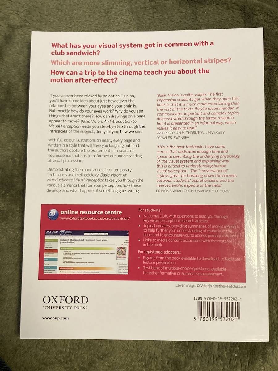 Basic Vision is an introductory guide to how our visual system interprets the world around us. Authored by Peter Thompson, Tom Troscianko, and Robert Snowden - with a combined research and teaching experience spanning over eighty years - the book walks readers through the intricate processes of perceiving size, color, motion, and spatial depth. Relying on detailed, full-color illustrations and step-by-step explanations, this second edition published in 2012 by Oxford University Press clarifies both the marvels and the occasional missteps of human vision, whether due to neurological glitches or visual illusions. Basic Vision combines contemporary neuroscience research with an engaging style that makes complex concepts accessible and thought-provoking.