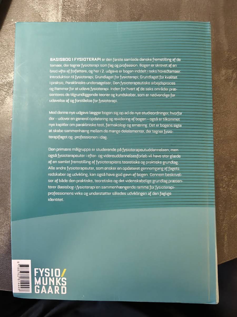 "Basisbog i fysioterapi" i 2. udgave præsenterer en grundig og samlet introduktion til de centrale principper og metoder, der kendetegner fysioterapien som fag og profession. Bogen rummer en mangfoldig samling bidrag fra anerkendte eksperter, herunder blandt andre Jane Andreasen, Jørn Hansen og Åse Brandt, og giver dermed en bred forankring i både teori og praksis. I denne opdaterede udgave udforskes fysioterapiens fundament gennem en række nøje udvalgte temaer, der spænder over det praktiske og det videnskabelige grundlag for faget. Læseren bliver budt velkommen til en dybdegående gennemgang af alt fra de teoretiske forudsætninger og kliniske kvalitetskriterier til de processuelle og samfundsmæssige perspektiver, som er afgørende for en moderne fysioterapeutisk praksis. Med sit omfattende indhold og klare struktur henvender bogen sig primært til studerende på fysioterapeutuddannelsen, men den er ligeledes en værdifuld ressource for praktiserende fysioterapeuter, der ønsker at opdatere og udvide deres faglige kompetencer. Denne 2. udgave understøtter udviklingen af den professionelle identitet og tilbyder læseren et solidt fundament for en reflekteret og evidensbaseret praksis.