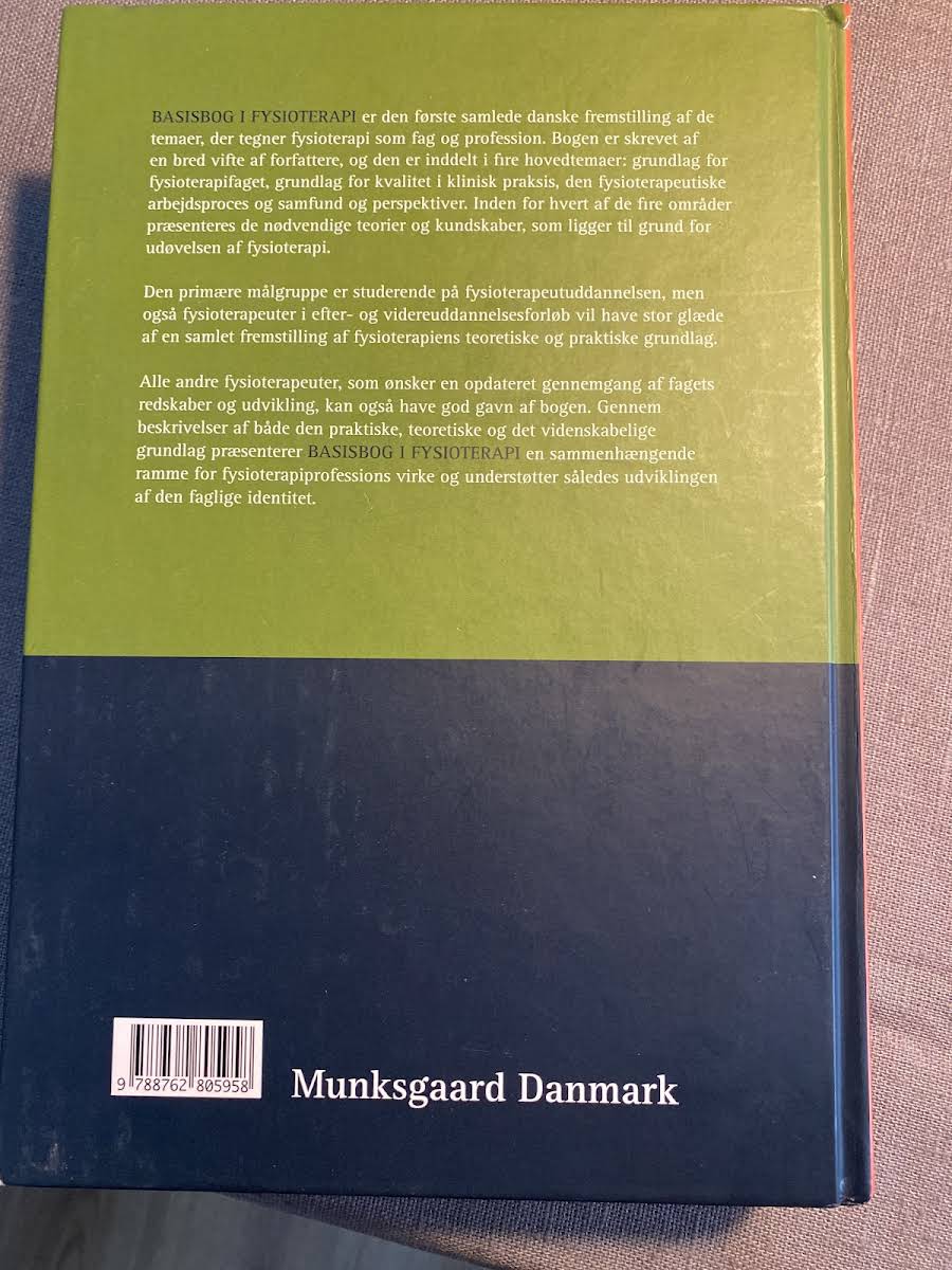 Basisbog i fysioterapi er en grundlæggende og samlende dansk fremstilling af den viden, der ligger til grund for professionen. Bogen spænder over temaer, der danner fundamentet for fysioterapi, med fokus på både menneskets anatomi, bevægelser og funktionelle processer. I takt med at bogen er opdelt i fire hovedområder – det teoretiske fundament, kvalitet i klinisk praksis, den fysioterapeutiske arbejdsproces samt samfundsmæssige perspektiver – får læseren en dybdegående introduktion til de centrale aspekter af faget. Denne holistiske tilgang gør værket særligt relevant for studerende, der er på vej ind i uddannelsen, men også for praktiserende fysioterapeuter, som ønsker at opdatere og udvide deres viden. Med bidrag fra et bredt forfatterteam bidrager Basisbog i fysioterapi til en afbalanceret forståelse af både de tekniske og teoretiske aspekter af praktisk og klinisk arbejde. Udgivet i 2010 af Munksgård Danmark og præsenteret i et solidt hardcover-format, er bogen et centralt redskab i studiet af fysioterapi og et værdifuldt referenceværk inden for feltet.