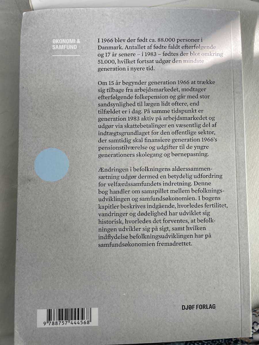 Bogen "Befolkning og samfund" dykker ned i, hvordan ændringer i befolkningens størrelse og alderssammensætning har påvirket det danske samfund. Med eksempler, der illustrerer, hvordan ca. 88.000 personer blev født i 1966 og kun omkring 51.000 i 1983 – den mindste generation i nyere tid – sættes fokus på de demografiske udviklingstendenser, der nu udfordrer velfærdssamfundets struktur. I takt med at generation 1966 gradvist træder tilbage fra arbejdsmarkedet og modtager pension, stilles der store krav til den yngre generations evne til at finansiere både fremtidige pensioner samt udgifter relateret til sundhed, skolegang og børnepasning. Bogen belyser, hvordan denne ulige fordeling af generationernes roller skaber både økonomiske og sociale udfordringer. Gennem fem kapitler undersøges, hvordan historiske tendenser inden for dødelighed, fertilitet og migration har formet den nuværende befolkningsudvikling. Samtidig gives der indblik i, hvordan disse demografiske ændringer forventes at påvirke samfundsøkonomien fremadrettet.