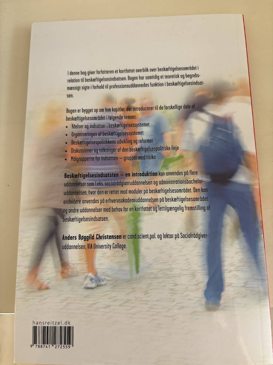 Bogen "Beskæftigelsesindsatsen" af Anders Bøggild Christensen giver et klart overblik over beskæftigelsesområdet med særligt fokus på de initiativer, der understøtter og udvikler beskæftigelsesindsatsen. Med et solidt teoretisk og begrebsmæssigt fundament undersøges professionsuddannedes rolle og funktion i denne centrale samfundsopgave. Strukturen er opbygget omkring fem nøje udvalgte kapitler, som hver især belyser centrale temaer: ydelser og indsatser i beskæftigelsessystemet, organiseringen af systemet, beskæftigelsespolitikkens udvikling og reformer, samt diskussioner og tolkninger af den beskæftigelsespolitiske linje. Det afsluttende kapitel sætter særligt fokus på de målgrupper, der løber størst risiko og har mest behov for støttende indsatser. Denne korte og lettilgængelige fremstilling af beskæftigelsesindsatsen er velegnet til moduler på uddannelser som socialrådgiver- og administrationsuddannelsen samt videregående uddannelser med behov for et klart overblik over beskæftigelsesområdet. Bogen fungerer således som et nyttigt redskab for både studerende og fagfolk, der søger en opdateret introduktion til området.