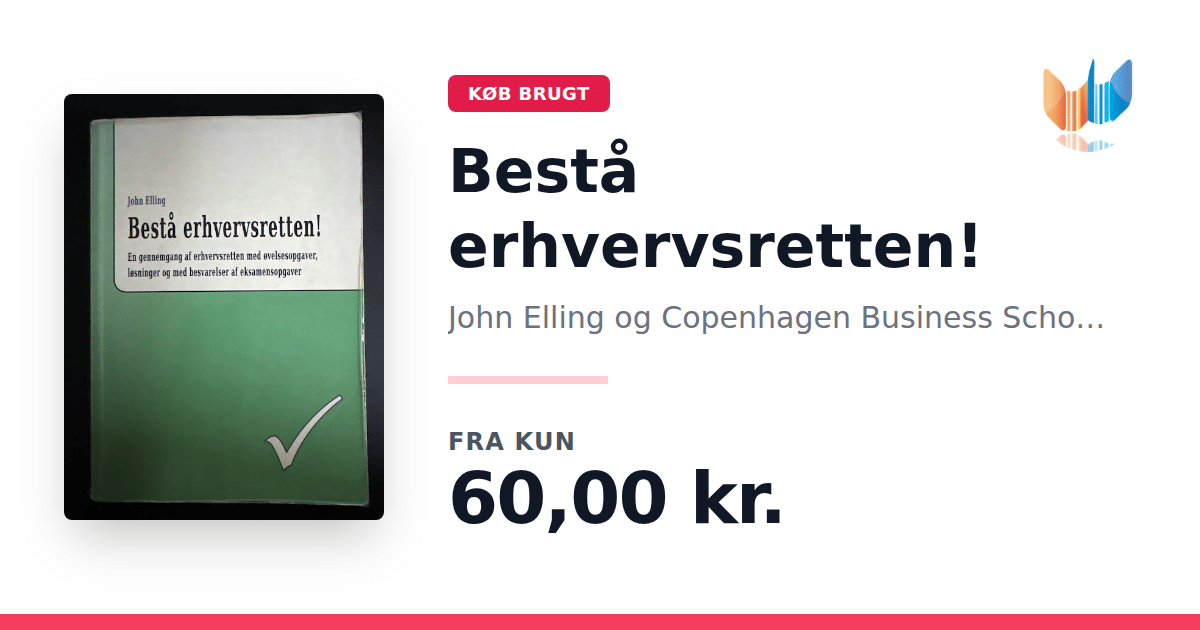 Lige nu kan du købe "Bestå erhvervsretten!" af John Elling og Copenhagen Business School. CBS. Law Department. LAW. Juridisk Institut. JUR til kun 60,00 kr. Bogen du ser her er brugt, og i slidt stand. Vi har i øjeblikket kun et enkelt eksemplar til salg af "Bestå erhvervsretten", så slå til mens du kan!