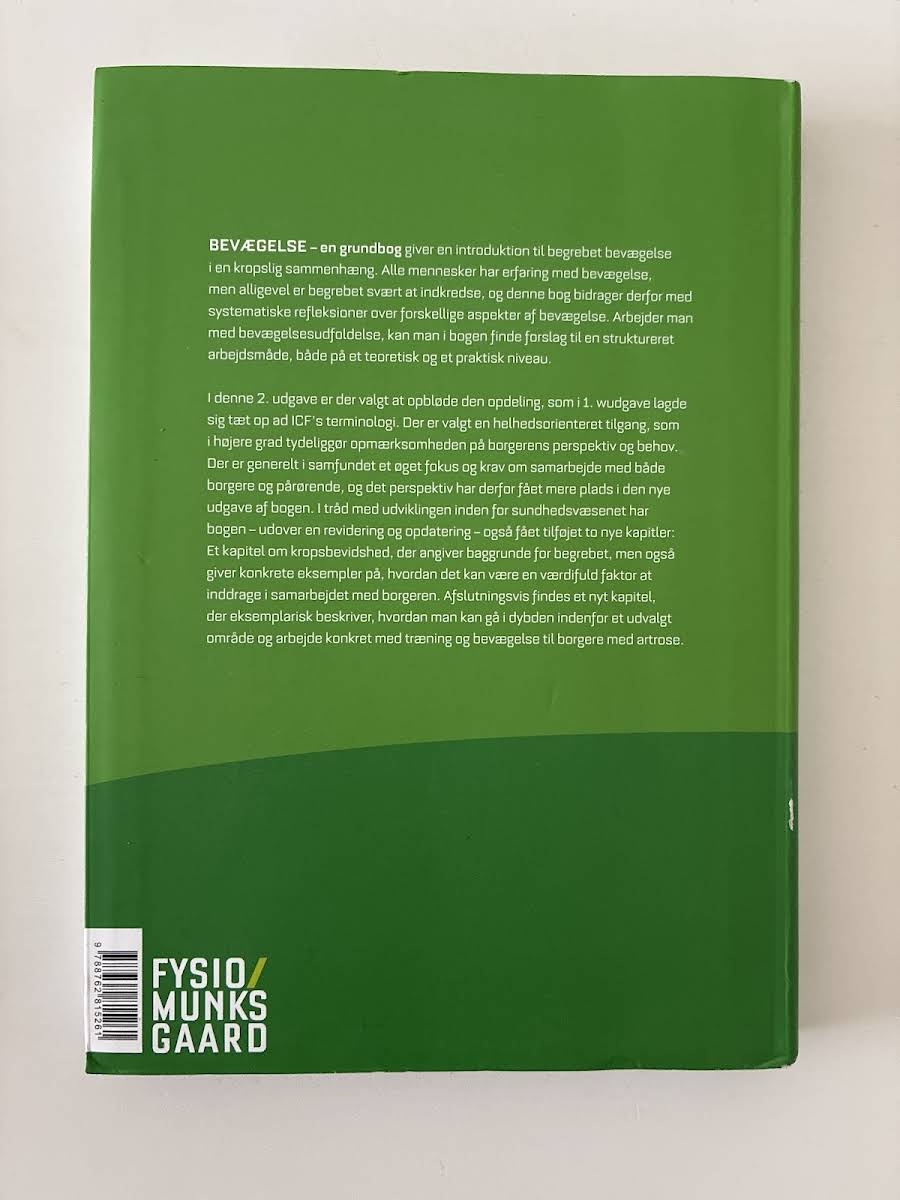 "Bevægelse" er en grundbog, der giver en introduktion til bevægelse som et kropsligt fænomen. Selvom alle har erfaring med bevægelse, er begrebet ofte vanskeligt at fastlægge. Bogen bidrager med systematiske refleksioner over forskellige aspekter af bevægelse, og den præsenterer en struktureret arbejdsmåde, som kan anvendes både teoretisk og praktisk. Med 328 sider tilbyder værket en helhedsorienteret tilgang, der fremhæver vigtigheden af at se den enkelte borgers perspektiv og behov. Ved at kombinere teoretiske overvejelser med konkrete forslag til bevægelsesudfoldelse, bliver læseren rustet til at gribe ind i og arbejde med bevægelse på en ny og nuanceret måde.
