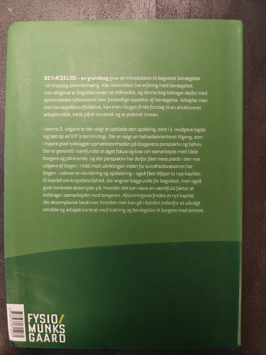 "Bevægelse" er en grundbog, der giver en introduktion til bevægelse som et kropsligt fænomen. Selvom alle har erfaring med bevægelse, er begrebet ofte vanskeligt at fastlægge. Bogen bidrager med systematiske refleksioner over forskellige aspekter af bevægelse, og den præsenterer en struktureret arbejdsmåde, som kan anvendes både teoretisk og praktisk. Med 328 sider tilbyder værket en helhedsorienteret tilgang, der fremhæver vigtigheden af at se den enkelte borgers perspektiv og behov. Ved at kombinere teoretiske overvejelser med konkrete forslag til bevægelsesudfoldelse, bliver læseren rustet til at gribe ind i og arbejde med bevægelse på en ny og nuanceret måde.