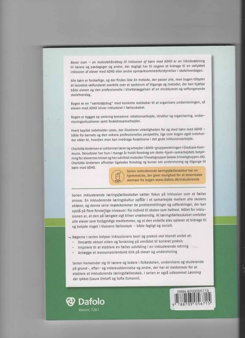 Lige nu kan du købe "Bevar roen. en metodehåndbog til inklusion af børn med ADHD" af Charlotte Andersen til kun 90,00 kr. Bogen du ser her er brugt, og i perfekt stand. Vi har i øjeblikket kun et enkelt eksemplar til salg af "Bevar roen. en metodehåndbog til inklusion af børn med ADHD", så slå til mens du kan!