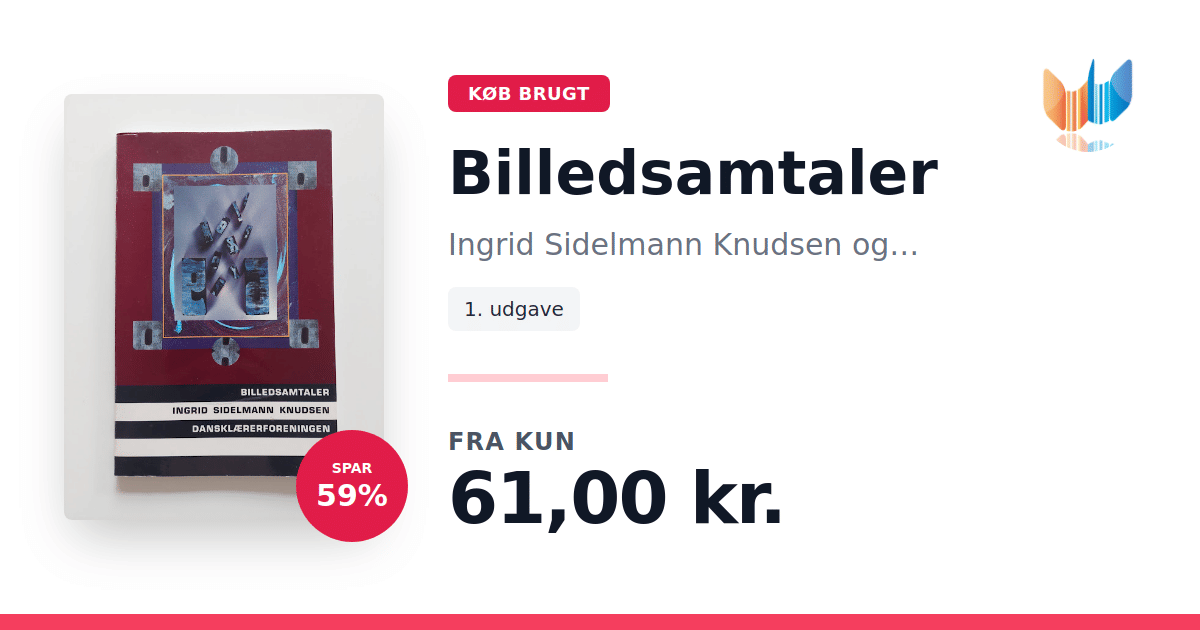 Lige nu kan du købe "Billedsamtaler" af Ingrid Sidelmann Knudsen og Dansklærerforeningen til kun 61,00 kr. Du sparer hele 59% af nyprisen! Bogen du ser her er brugt, og i perfekt stand. Vi har i øjeblikket 2 eksemplarer til salg af "Billedsamtaler", så husk at se de forskellige udgaver.