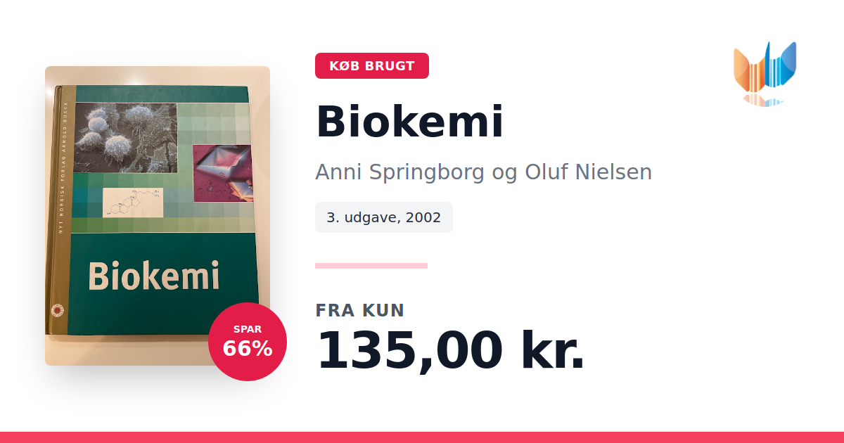 Lige nu kan du købe "Biokemi" af Anni Springborg og Oluf Nielsen til kun 135,00 kr. Du sparer hele 66% af nyprisen! Bogen du ser her er brugt, og i perfekt stand. Vi har i øjeblikket 5 eksemplarer til salg af "Biokemi", så husk at se de forskellige udgaver.