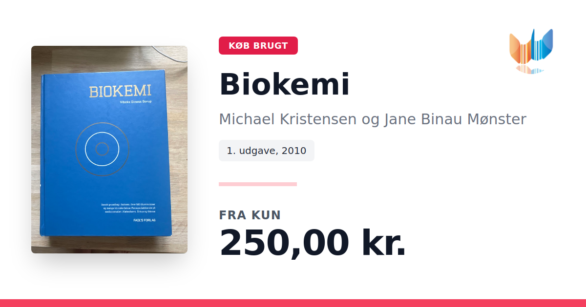 Lige nu kan du købe "Biokemi" af Michael Kristensen og Jane Binau Mønster til kun 250,00 kr. Bogen du ser her er brugt, og i god stand. Vi har i øjeblikket 2 eksemplarer til salg af "Biokemi", så husk at se de forskellige udgaver.