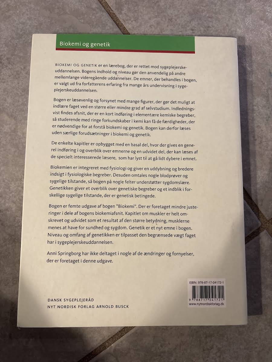 Biokemi og genetik er en alsidig lærebog designet til studerende på sygeplejerskeuddannelsen og andre sundhedsrelaterede studieretninger. Bogen bygger på mange års erfaring med at formidle komplekse fagområder på en tilgængelig måde, hvor både basale og avancerede emner bliver præsenteret med klarhed og overskuelighed. Indledende kapitler giver en kort og præcis introduktion til grundlæggende kemiske principper, så studerende uden omfattende forkundskaber i kemi får de nødvendige redskaber til at forstå de videregående emner. Hvert kapitel er struktureret med en grundlæggende del for at skabe et overblik, efterfulgt af en udvidet sektion for dem, der ønsker at dykke dybere ned i stoffet. Bogens integrerede tilgang til biokemi og fysiologi bidrager til en bredere forståelse af kroppens processer samt de underliggende mekanismer bag sygdomme. Endvidere giver indslaget i genetik et solidt overblik over genetiske principper og de arvelige sygdomstilstande, der er relevante for sundhedssektoren. I denne femte udgave er seneste justeringer og en nyligt tilføjet sektion om genetik med til at skærpe fokus på de emner, der har fået øget betydning i relation til moderne sygepleje og sygdomslære.