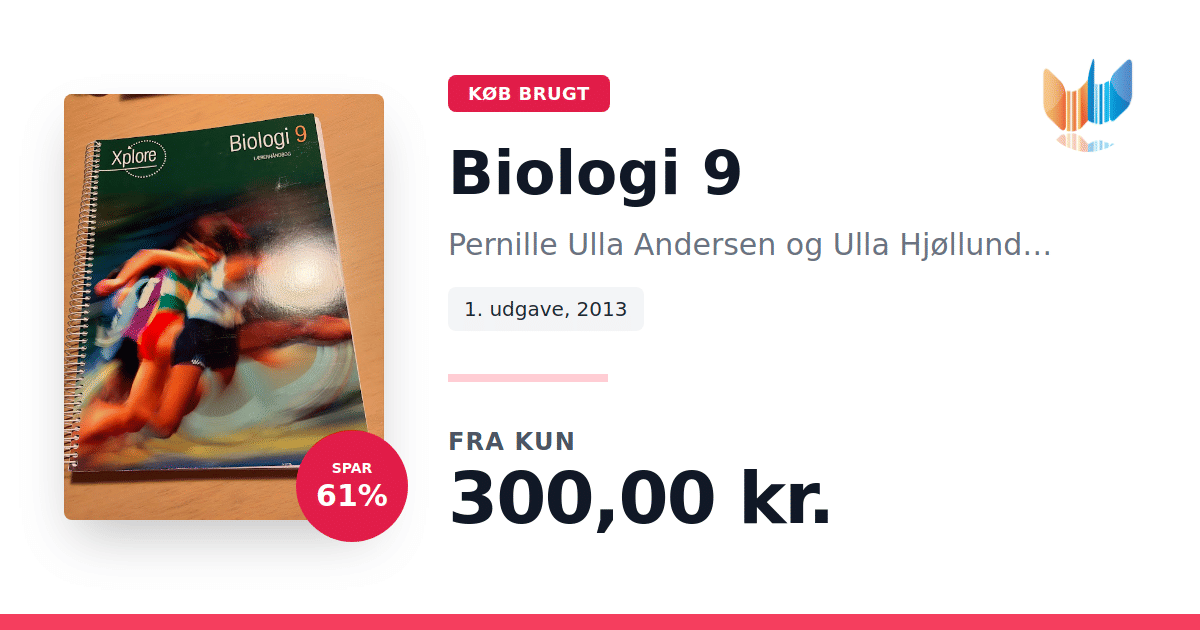 Lige nu kan du købe "Biologi 9" af Pernille Ulla Andersen og Ulla Hjøllund Linderoth til kun 300,00 kr. Du sparer hele 61% af nyprisen! Bogen du ser her er brugt, og i slidt stand. Vi har i øjeblikket kun et enkelt eksemplar til salg af "Biologi 9", så slå til mens du kan!