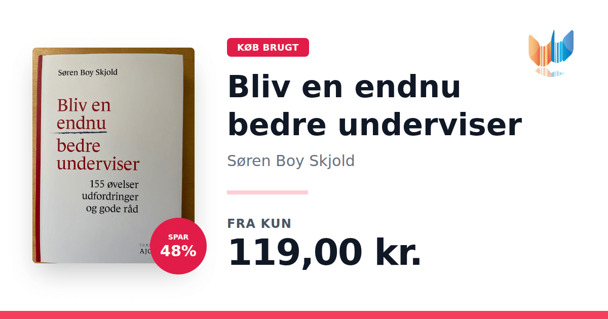 Lige nu kan du købe "Bliv en endnu bedre underviser" af Søren Boy Skjold til kun 119,00 kr. Du sparer hele 48% af nyprisen! Bogen du ser her er brugt, og i perfekt stand. Vi har i øjeblikket kun et enkelt eksemplar til salg af "Bliv en endnu bedre underviser", så slå til mens du kan!