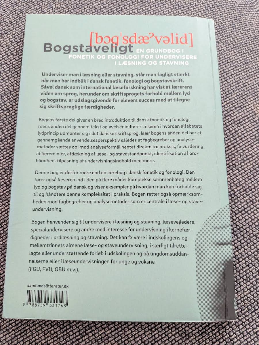 Bogstaveligt by Martin Hauerberg Olsen, udgivet af Samfundslitteratur i 2018, giver underviserne et solidt fagligt fundament. Bogen understreger vigtigheden af at have indblik i dansk fonetik, fonologi og bogstavskrift; en forståelse, som er altafgørende for at styrke elevers evne til ordlæsning og stavning. Med en inddeling i to dele præsenterer bogen først en bred introduktion til de sproglige fænomener, der danner grundlaget for dansk skrift. Herefter følger en praktisk orienteret del, hvor tekst og øvelser illustrerer, hvordan alfabetets lydprincipe manifesterer sig i det danske sprog. Bogstaveligt giver således et redskab til, hvordan man kan analysere og håndtere den komplekse sammenhæng mellem lyd og bogstav, og illustrerer, hvordan fagbegreber og analysemetoder anvendes i konkrete undervisningssituationer. Bogen henvender sig til undervisere i læse- og staveundervisningen, læsevejledere og specialundervisere, samt andre med et fagligt engagement i at styrke kernefærdighederne i dansk ordlæsning og stavning.