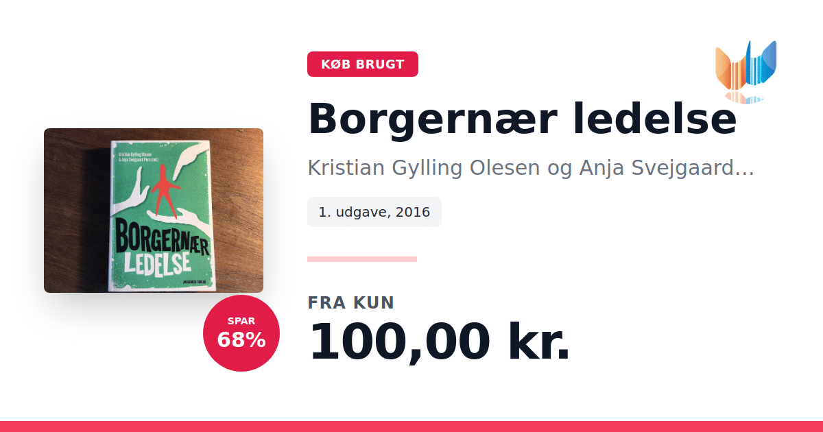Lige nu kan du købe "Borgernær ledelse" af Kristian Gylling Olesen og Anja Svejgaard Pors til kun 100,00 kr. Du sparer hele 68% af nyprisen! Bogen du ser her er brugt, og i perfekt stand. Vi har i øjeblikket kun et enkelt eksemplar til salg af "Borgernær ledelse", så slå til mens du kan!