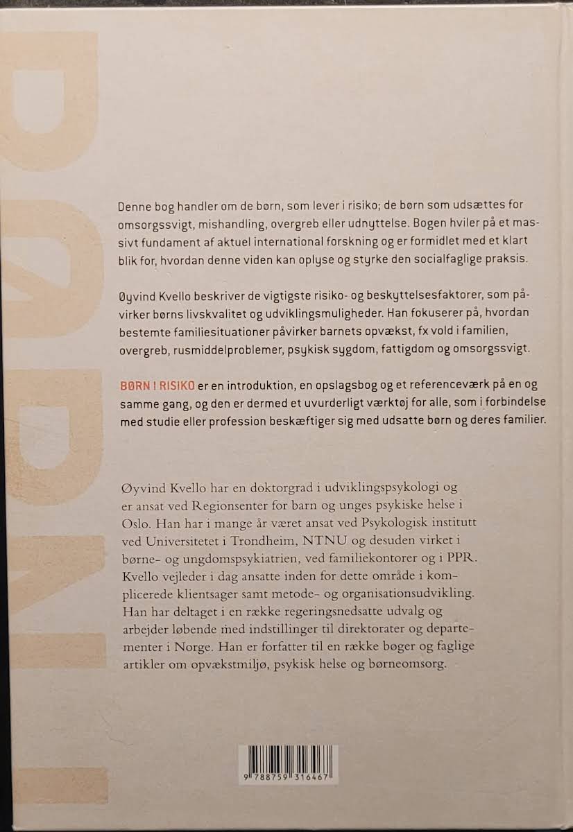 "Børn i risiko" giver et indsigtsfuldt blik på de udfordringer, som udsatte børn møder, når de lever under forhold præget af omsorgssvigt, mishandling, overgreb og fattigdom. Øyvind Kvello trækker på en solid international forskningsbase og præsenterer på en klar og struktureret måde, hvordan forskellige familiesituationer og samfundsmæssige forhold kan påvirke børns udvikling og livskvalitet. Bogen fungerer som et uvurderligt redskab for praktikere og studerende, der arbejder med udsatte børn og familier. Med fokus på både risikofaktorer og beskyttende elementer tilbyder "Børn i risiko" en dybdegående analyse af, hvordan et barns opvækst og omgivelser kan forme dets fremtid. Denne omhyggeligt dokumenterede tilgang gør bogen til en central inspirationskilde og et vigtigt bidrag til arbejdet med socialfaglig praksis.