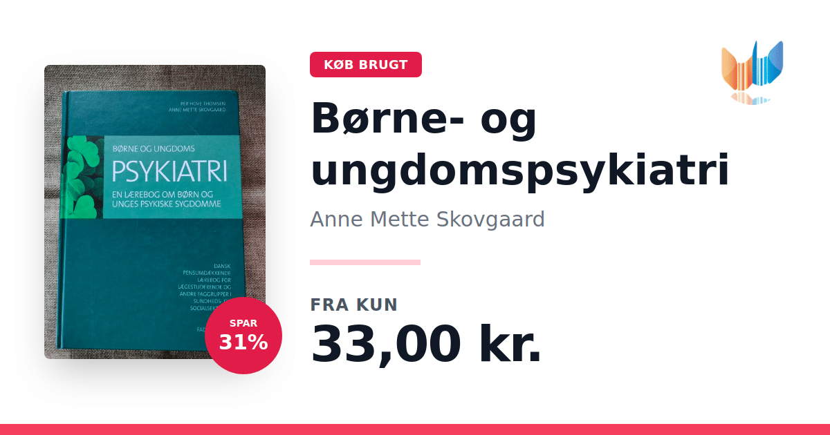 Lige nu kan du købe "Børne- og ungdomspsykiatri" af Anne Mette Skovgaard til kun 33,00 kr. Du sparer hele 31% af nyprisen! Bogen du ser her er brugt, og i perfekt stand. Vi har i øjeblikket 2 eksemplarer til salg af "Børne- og ungdomspsykiatri", så husk at se de forskellige udgaver.