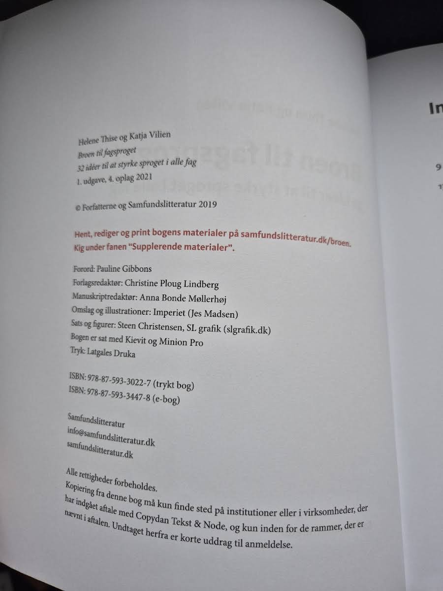 Sproget er nøglen til forståelse og kommunikation, og spiller derfor en central rolle i læringen. I Broen til fagsproget præsenteres en helhedsorienteret tilgang til udvikling af sprog i skolens fag, inspireret af Pauline Gibbons’ banebrydende værk Styrk sproget, styrk læringen (2016). Bogen tilbyder en praksisnær guide fyldt med konkrete idéer og redskaber til faglærere, der ønsker at skabe en sprogudviklende undervisning. Målet er at opnå en øget faglig forståelse og forbedre elevproduktionen både skriftligt og mundtligt, så elevernes svar bliver mere uddybende og meningsfulde. Broen til fagsproget indeholder en række praktiske elementer, herunder en menu af undervisningsaktiviteter, redigerbare skabeloner og eleveressourcer, samt oversigter over, hvordan aktiviteterne kan implementeres. Bogen introducerer desuden bromodellen, en hjælp til at planlægge og reflektere over undervisningen med et konstant fokus på sprogudvikling, samt værktøjer som Sprogluppen og Tænkekort til at identificere det sprog, der er essentielt at arbejde med. Henvendt primært til lærere, fungerer bogen som en håndbog og idébank, der understøtter den daglige undervisningspraksis. Samtidig kan andetsprogsvejledere, undervisere i dansk som andetsprog og studerende drage nytte af inspirationen i bogen, som understreger de flersprogede elevers læringspotentiale.