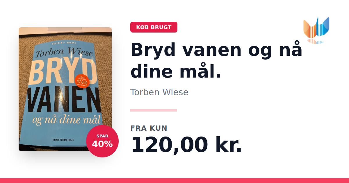 Torben Wiese præsenterer den fjerde, reviderede udgave af Bryd vanen og nå dine mål, hvor vanetænkningens begrænsninger kortlægges, og vejen til personlig og faglig succes demonstreres. Bogen viser, hvordan du formulerer klare, motiverende mål og i praksis systematisk ændrer dine vaner, så du når dem. Værktøjerne henvender sig til både virksomheder og private, der ønsker at gå fra forandringsparate til forandringsskabende. Denne udgave indeholder nye kapitler om arbejdsglæde, Work-Life Balance, stress samt vanestyret kommunikation. Om forfatteren Torben Wiese har i 25 år arbejdet med forandringsprocesser, stress, ledelse og arbejdsglæde. Han er forfatter til Bøj fisken mens den er frisk og fast stemme i Lørdagspanelet på DR P4. Den tidligere udgave af Bryd vanen har solgt næsten 40.000 eksemplarer.