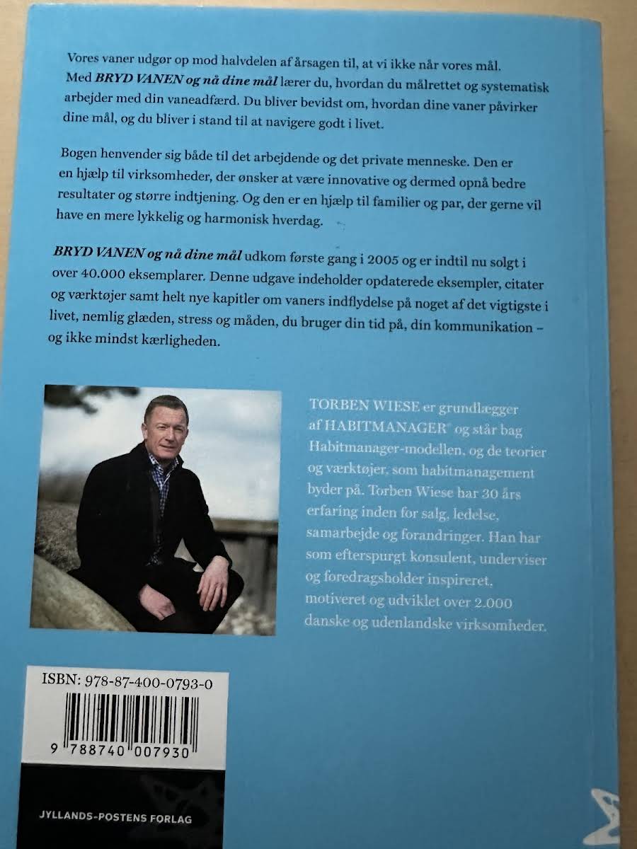 Torben Wiese præsenterer den fjerde, reviderede udgave af Bryd vanen og nå dine mål, hvor vanetænkningens begrænsninger kortlægges, og vejen til personlig og faglig succes demonstreres. Bogen viser, hvordan du formulerer klare, motiverende mål og i praksis systematisk ændrer dine vaner, så du når dem. Værktøjerne henvender sig til både virksomheder og private, der ønsker at gå fra forandringsparate til forandringsskabende. Denne udgave indeholder nye kapitler om arbejdsglæde, Work-Life Balance, stress samt vanestyret kommunikation. Om forfatteren Torben Wiese har i 25 år arbejdet med forandringsprocesser, stress, ledelse og arbejdsglæde. Han er forfatter til Bøj fisken mens den er frisk og fast stemme i Lørdagspanelet på DR P4. Den tidligere udgave af Bryd vanen har solgt næsten 40.000 eksemplarer.