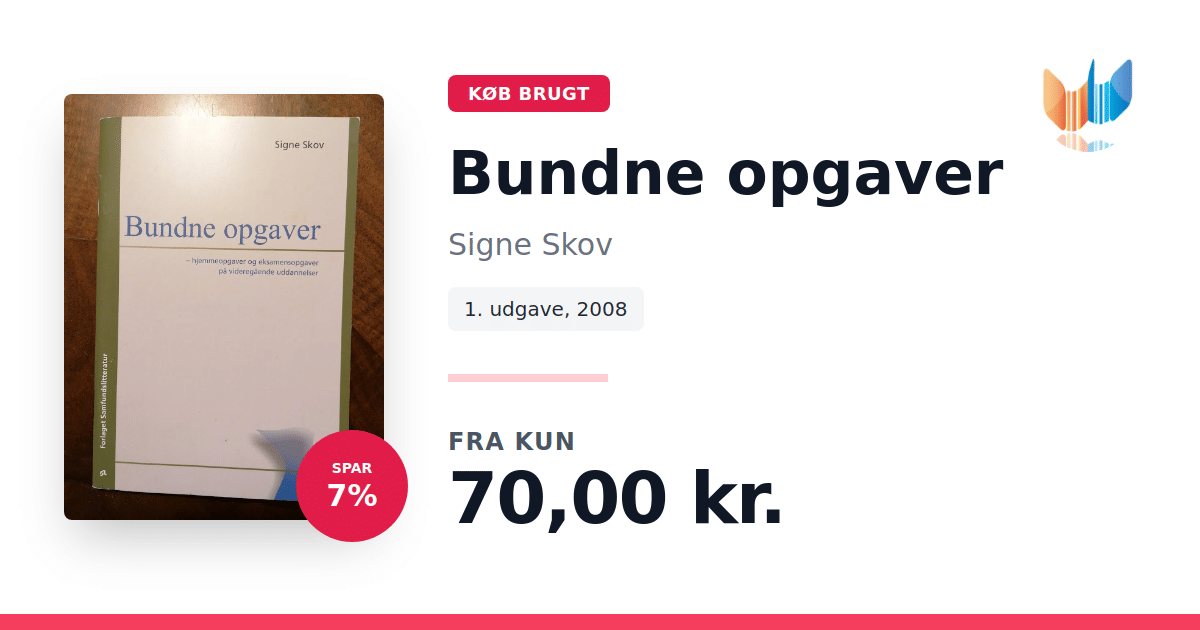 Lige nu kan du købe "Bundne opgaver" af Signe Skov til kun 70,00 kr. Du sparer hele 7% af nyprisen! Bogen du ser her er brugt, og i god stand. Vi har i øjeblikket kun et enkelt eksemplar til salg af "Bundne opgaver", så slå til mens du kan!
