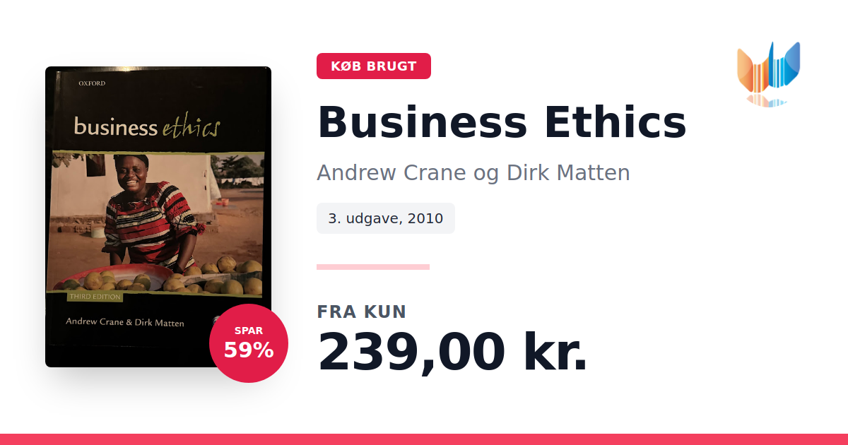Lige nu kan du købe "Business Ethics" af Andrew Crane og Dirk Matten til kun 239,00 kr. Du sparer hele 59% af nyprisen! Bogen du ser her er brugt, og i perfekt stand. Vi har i øjeblikket kun et enkelt eksemplar til salg af "Business Ethics", så slå til mens du kan!