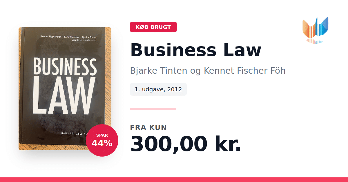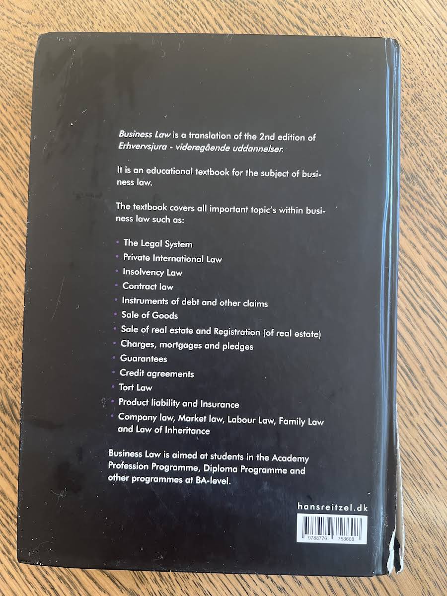 "Business Law" er den engelske oversættelse af den 2. udgave af "Erhvervsjura – videregående uddannelser" og er en grundlæggende lærebog inden for erhvervsjura. Med sine 714 sider præsenterer bogen et solidt fundament i de væsentligste juridiske discipliner, som er relevante for studerende på akademiprogrammer og diplomuddannelser. Tekstbogen gennemgår nøje centrale emner såsom retssystemet, aftaleret, køb, handel med fast ejendom, tinglysning og kaution. Yderligere behandler den erstatningsret, produktansvar, selskabsret og konkurrenceret, hvilket sikrer en bred og opdateret forståelse af faget erhvervsjura.